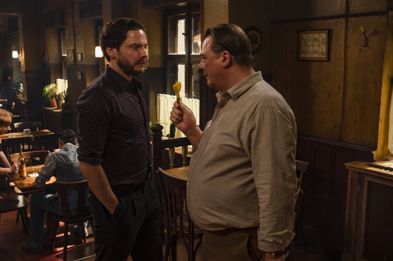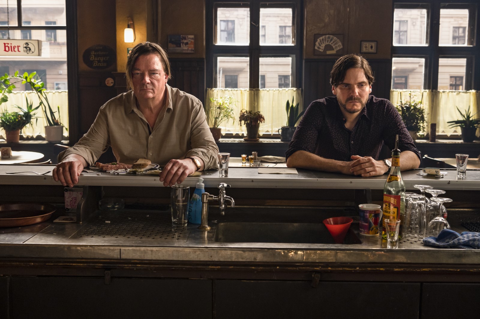 La mise en scène choisit un point de vue quasi théâtral. Certaines scènes montrent de longues déambulations dans Berlin. Mais la plupart des séquences se déroulent dans un café du coin où quelques vieux habitués dépérissent derrière leur verre de schnaps. On perçoit que le souvenir de l’ex-RDA qui cohabitait avec l’Allemagne de l’Ouest n’est pas totalement digéré. Les visions du monde s’opposent entre ce comédien bourgeois, ouvert sur le monde, et cet homme sans âge, amer, que la vie maintient dans un état quasi mortifère. En même temps, Daniel Brühl raconte la difficulté pour les personnages célèbres de se libérer du regard des autres et de vivre leur propre existence, dans une forme d’anonymat. Pour autant, le réalisateur n’en rajoute pas dans une complaisance douteuse. Il se plaît à faire grincer les dents et à filmer le destin d’un homme qui se défait. Les mots se bousculent dans une comédie habile où le personnage principal s’effondre dans sa propre créature que son métier d’acteur a construite.