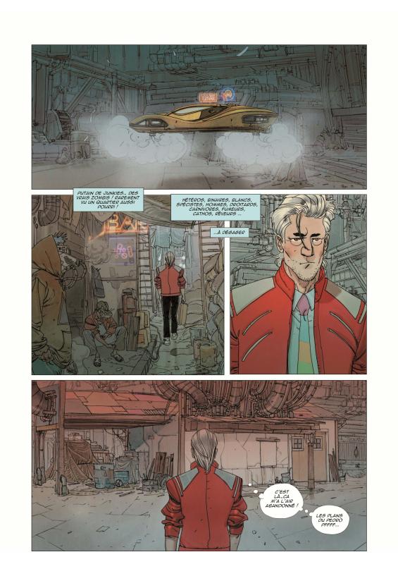 Critique : Une nouvelle fois, le ton et le dessin reconnaissables de Jef, ici épaulé par Corbeyran, se repèrent aisément. L’ironie mordante qui croque une société se retrouve presque naturellement, avec ici un wokisme fasciste arrivé au pouvoir, menaçant de prison ceux qui s’aviseraient de manger de la viande ou de marcher sur les pieds d’une dame, où les trans sont la majorité et où les véhicules à essence sont bannis à vie. Bref, le cauchemar des ultras conservateurs, et qu’il est finalement bon de montrer pour en voir toute la dérision. Pour autant, les dénonciations ne sont pas toutes des caricatures grotesques, puisque le tourisme spatial, cœur de l’enquête de l’album, est un problème actuel, tout comme la mainmise des multinationales sur la politique des États. Les dialogues savoureux et les multiples comiques de geste (coups dans les parties notamment) donnent quant à eux une légèreté à l’enquête, comme si Blade Runner avait croisé le ton d’un humoriste de France Inter.