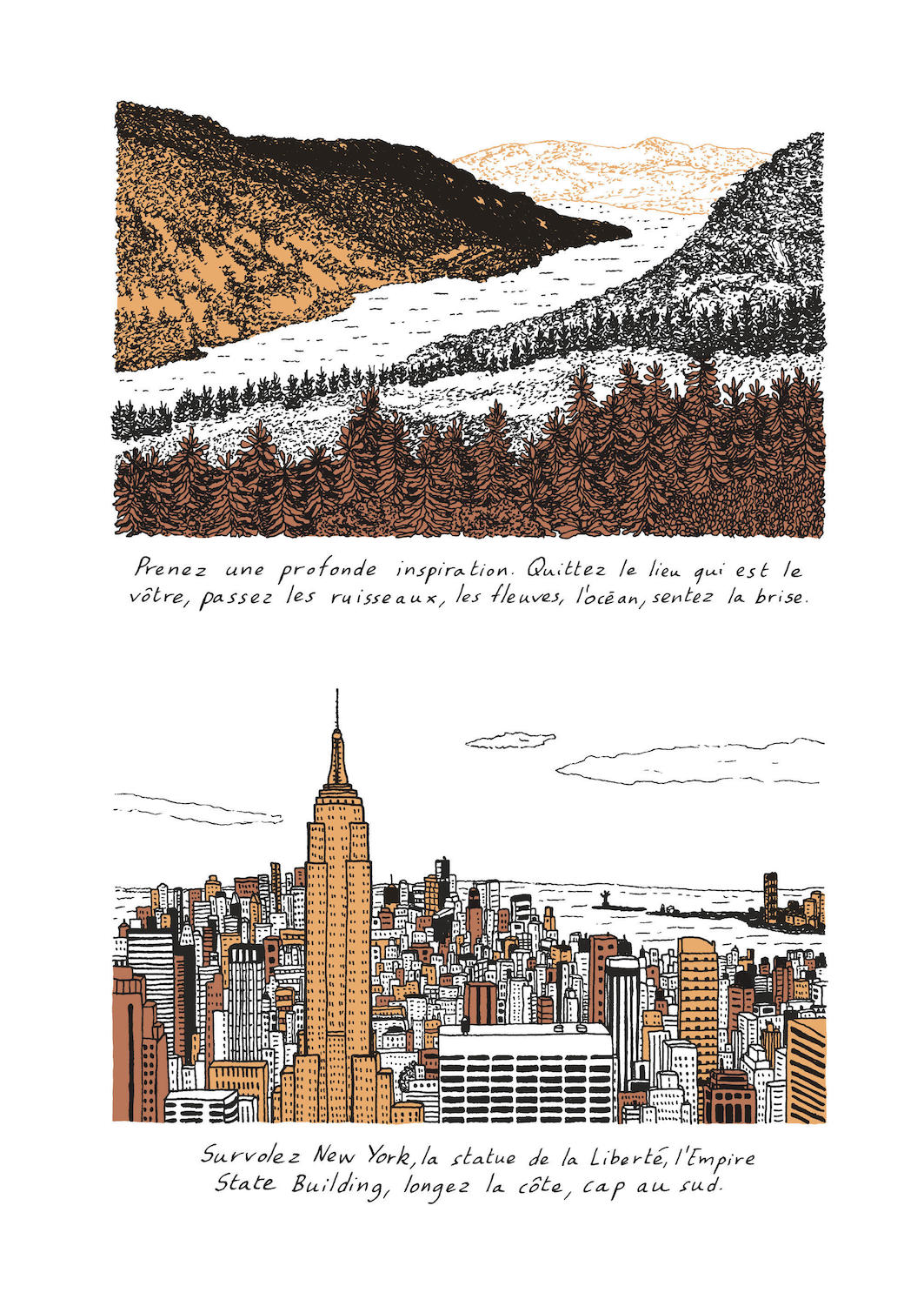 Sur des mots en forme d’hypnose, Émilie Plateau démarre judicieusement son récit avec des tonalités de bruns, ocres, jaunes, noir et blanc. Les couleurs de l’ouvrage s’accordent évidement avec le thème.