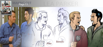 Au début, Un gros travail avec les scénaristes pour savoir quelle atmosphère apporter à l’album. Il faut surtout gérer le nombre de pages et prévoir des situations originales pour ne pas ennuyer graphiquement le lecteur. Ensuite on se visionne toute la série TV en boucle (avec pleins de pizzas et de pop corn :)) et on cherche les petites mimiques de chacun... le tout étant de trouver un bon compromis entre inspiration et création ! La suite est classique : storyboard, dessin, encrage, couleur . . .