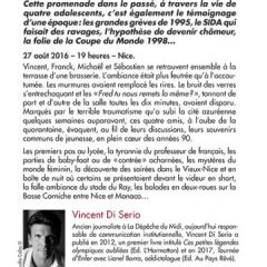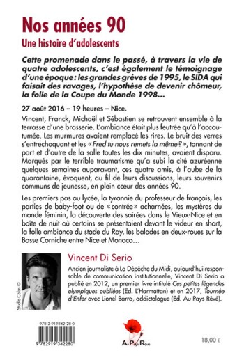 Dans un style journalistique, simple et précis, Vincent Di Serio raconte une histoire d’adolescents qui pourrait être universelle. Au-delà de la simple succession d’anecdotes, il retrace les évènements marquants de cette décennie : les grèves de 1995 qui ont paralysé le pays, la coupe du Monde de football 98…et les fléaux de cette époque : le SIDA et le chômage de masse.