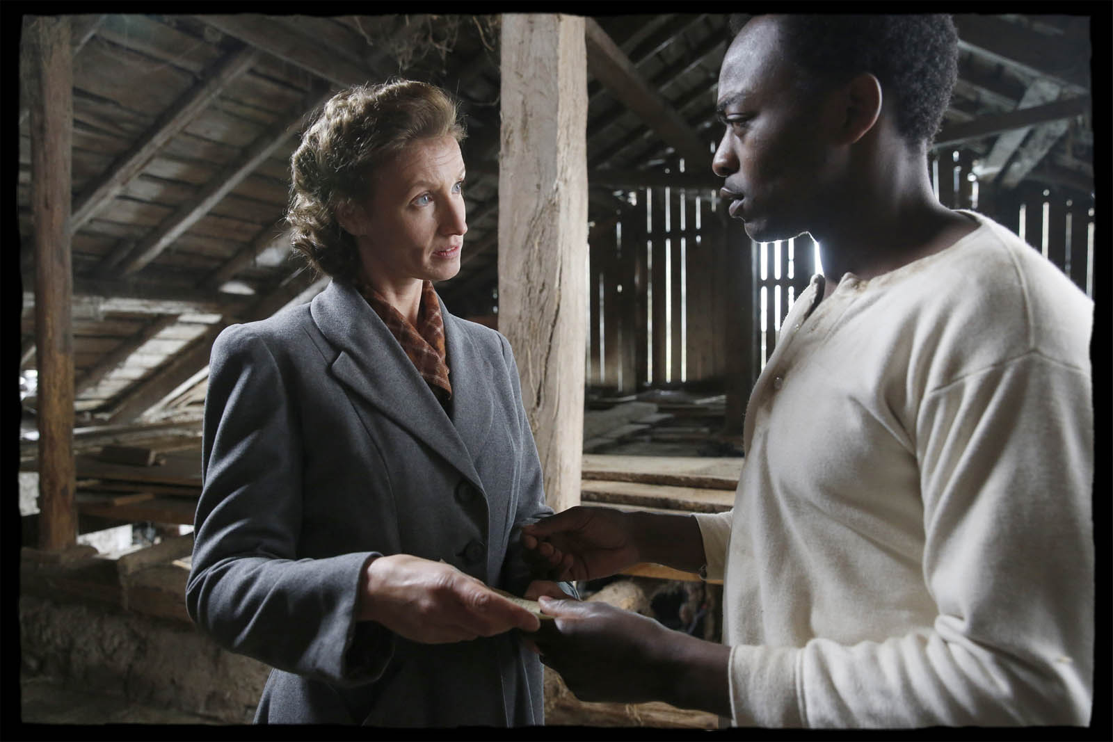 La scène d’ouverture au rythme tendu et au cynisme foudroyant pourrait bien constituer les prémices d’une œuvre haletante. Il n’en sera pourtant rien. Une volonté affichée de bien faire et le désir de s’adresser au plus grand nombre nous infligent une leçon d’Histoire plus proche de l’exposé scolaire à la rigueur appliquée que de l’exaltation qu’un sujet aussi poignant pouvait nous laisser espérer. Entre colonialisme et Résistance, le message historique ne manque pourtant pas d’intérêt, d’autant que les scènes extérieures filmées dans les décors naturels où se déroulèrent précisément les événements évoqués sont magnifiquement mises en lumière et les codes vestimentaires si spécifiques à cette période sont respectés avec précision. Malgré une mise en scène soignée, faute de tension et de sentiments exaltés, le spectateur ne parvient pas à s’approprier pleinement ce morceau d’Histoire conté sur un ton linéaire et peuplé de personnages secondaires caricaturaux peu mis en valeur. Dès lors, tous les Allemands sont relégués au rang de monstres pendant que les Résistants ne peuvent qu’être totalement exemplaires. Au milieu de cette peinture en noir et blanc se glisseront quand même un ou deux lâches collabos histoire de tenter de griser un peu le tableau. La palme du manichéisme revient à Christine (Alexandra Lamy toujours aussi énergique et lumineuse), institutrice à la droiture et au dévouement sans faille, en butte à un mari (Antoine Chappey) veule et égoïste que l’on ne peut imaginer autrement qu’en délateur. Elle disparaîtra sans plus d’explications au bout de quelques scènes pour être remplacée par la jeune Louane Emera, incarnant Marie, une bénévole de la Croix-Rouge dont la fraîcheur et l’enthousiasme juvénile masquent judicieusement un jeu encore incertain.