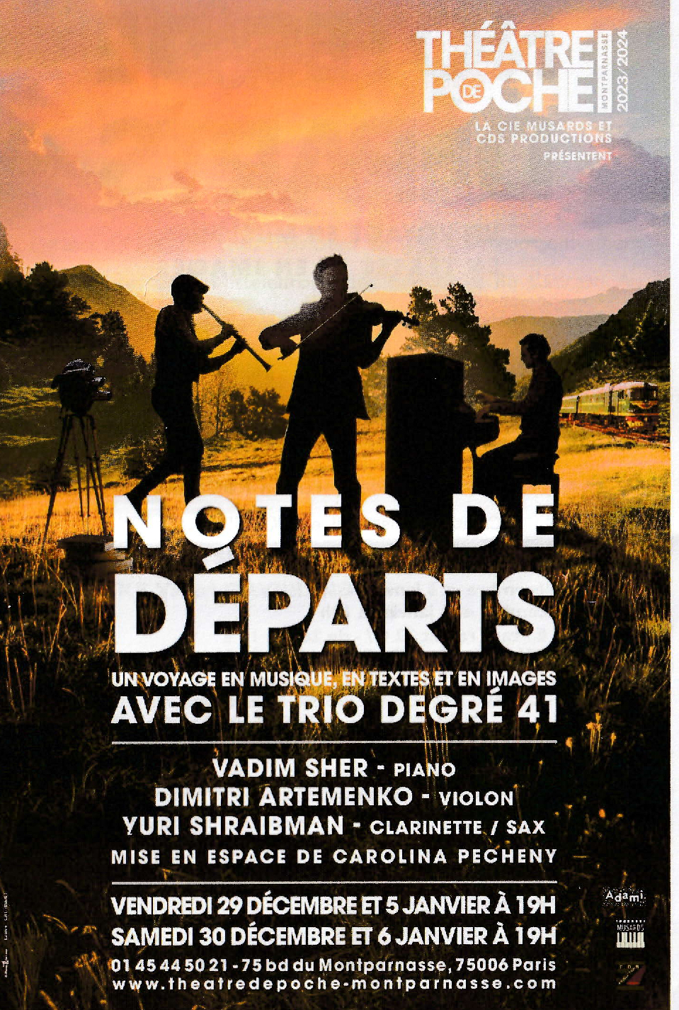 Critique : Trois musiciens surgissent des coulisses et prennent le temps d’installer leur matériel : instruments, partitions, livres. Ici, tout se passe en famille. Dans cette toute petite salle du Poche Montparnasse, le public est proche des artistes. Dimitri et Vadim sont natifs d’’Estonie, Yuri d’Ukraine. Tous trois composent le trio Degré 41 dont le nom fait référence au groupe poétique avant-gardiste fondé par les exilés russes à Tbilissi en 1918. Pour leur premier spectacle, ils choisissent tout naturellement de nous parler de départs, sous toutes leurs formes. D’abord et surtout de l’exil vécu par leurs familles respectives, les doutes et les désillusions qui l’entourent puis vient le mariage qui représente un nouveau départ dans la joie ou l’émotion, la raison ou la folie ; et enfin l’envol définitif vers l’au-delà, celui qui, à l’instar d’Olga dans Les Trois sœurs de Tchekhov interroge sur le sens de l’existence.