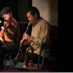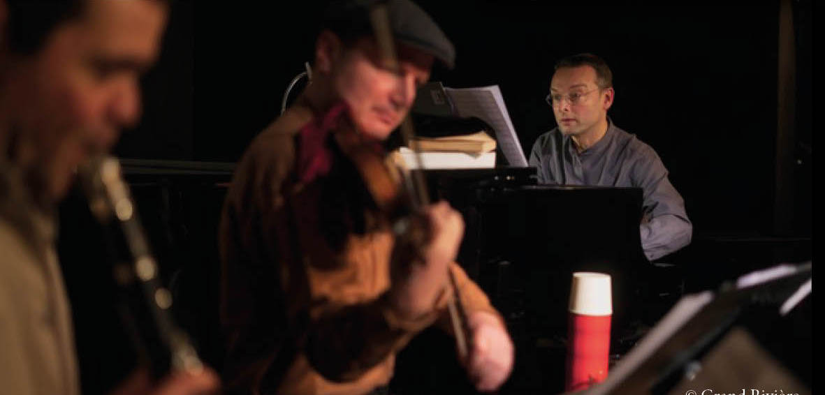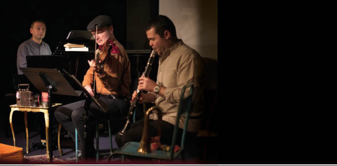Musique, littérature projections vidéo illustrent ces cheminements de vie tous différents auxquels chacun des musiciens apporte sa touche personnelle et sa sensibilité. Yuri, clarinettiste et saxophoniste, bercé toute son enfance par les chants yiddish de sa babouchka et de sa mère nous régale de ses improvisations aux couleurs jazzy tandis que Dimitri, violoniste, arrangeur et compositeur aux mille facettes, fait dialoguer musique classique et traditionnelle des pays de l’Est. Vadim, lui, fait office de chef d’orchestre. La voix posée, joliment rehaussée d’une légère pointe d’accent slave et l’œil pétillant de la joie qu’il se fait de nous révéler quelques textes rares de Kafka, Baudelaire, Pelevine, Nemirovsky, Tchekhov, il évolue, à l’aise, entre musique, littérature et cinéma. Mais bien vite, il lui faut rejoindre son piano pour retrouver ses deux complices et faire vibrer, avec la précision et le talent qui les caractérisent tous, les sons tziganes, klezmers, balkaniques, caucasiens.