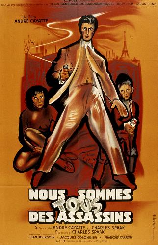 En même temps, ces personnages et les dialogues qui les font vivre sont symptomatiques d’un certain cinéma faussement social des années 50. À l’instar des paysans de Jeux interdits, sorti la même année, cet échantillon de la France profonde est davantage fondé sur des stéréotypes, loin de la véracité sociologique à laquelle Cayatte pourrait prétendre : le sadisme du patron qui recueille le petit Michel ou le caractère borné du père de l’avocat traduisent un certain manichéisme, l’auteur n’étant guère tendre avec certains de ses personnages. Et quand une chiffonnière (interprétée par l’excentrique Yvonne de Bray) accorde des circonstances atténuantes à un tueur d’enfant, on est dans le registre du propos de café de commerce que l’avocat Cayatte prétend justement combattre. Tel quel, le film ne mérite donc ni louanges ni sévérité. Si le cinéaste sera par la suite dépassé sur son propre terrain et tombera dans l’académisme (Verdict, avec Sophia Loren et Jean Gabin, sera une caricature de sa démarche), Nous sommes tous des assassins reste un étalon du film humaniste. Sans atteindre la force de La Pendaison d’Oshima ou de Tu ne tueras point de Kieslowski, œuvres majeures d’authentiques artistes, le film est précurseur d’un courant qui englobera des cinéastes aussi divers que Costa-Gavras, Tim Robbins ou Michael Moore.