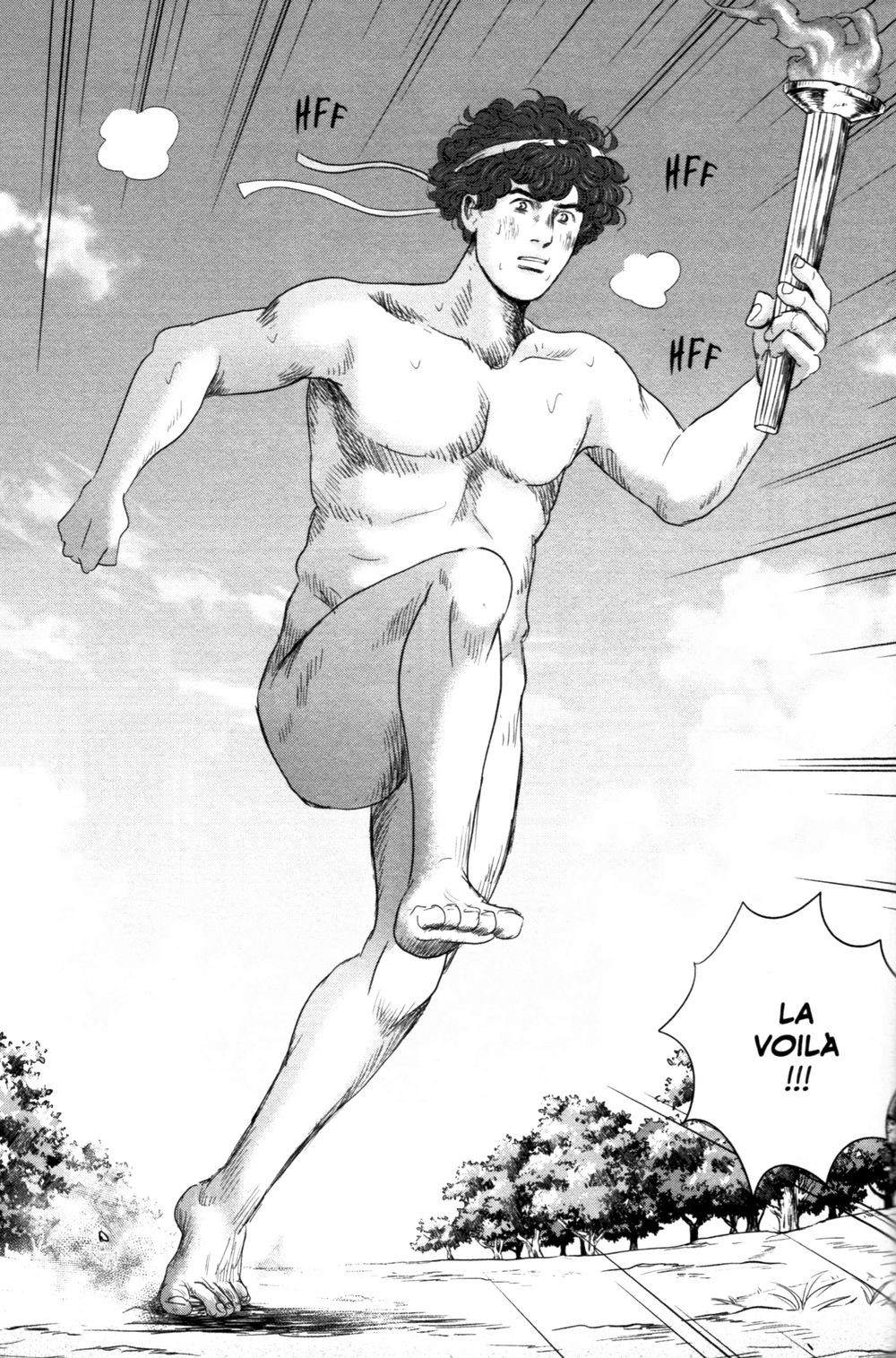 Yamazaki fait partie de ces mangakas qui aiment l’Europe, et celle-ci adore en particulier l’Antiquité. Après Thermae Romae, Pline, c’est donc la Grèce antique et ses fameux Jeux Olympiques qui sont adaptés à la sauce samouraï. Le plus fou dans cette histoire de voyage flash spatio-temporel (vraiment spatial, puisqu’entre la Grèce et le Japon, il y a un sacré décalage), de jeune homme pas adapté à son époque, aussi ingénu devant les femmes que face à plusieurs dizaines de milliers de Japonais amassés pour assister aux JO de 1964, c’est que ça marche. On s’amuse volontiers de cet homme habitué à courir nu, de son émerveillement lors de son transport dans une époque moderne… D’ailleurs, il est intéressant que l’autrice n’ait pas choisi les JO de 2020 (ou plutôt 2021), mais plutôt de repartir dans un passé pas si proche, puisque datant d’avant la naissance de l’autrice. Cet enchevêtrement de références n’est pas dérangeant, bien au contraire, et veut de toute manière uniquement vanter le sport en général, et l’esprit olympique en particulier.