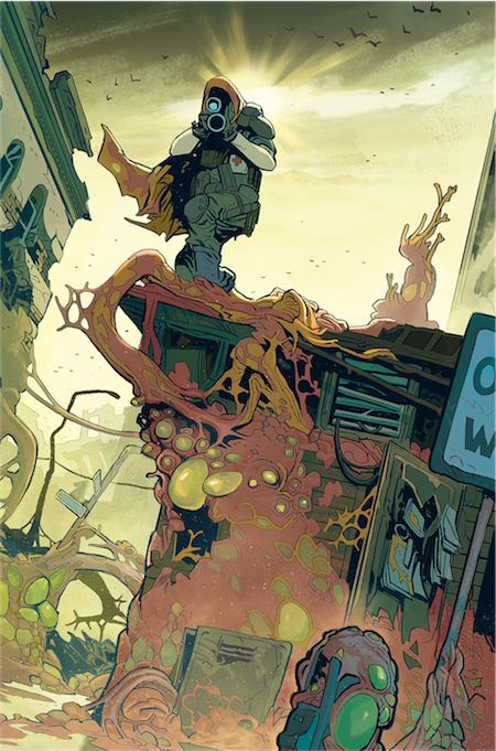 Voyage inter-dimensionnel, faune et flore hostiles et difformes, rédemption et salvation, les ingrédients pour une nouvelle série à succès sont réunis dans ce premier tome d’Oblivion Song, la nouvelle série du scénariste de Walking Dead Robert Kirkman. C’est avec Lorenzo De Felici qu’il entame, connu notamment lui pour son travail sur Infinity 8 récemment. Un duo qui promet, et ces promesses sont nombreuses. Tout d’abord, un scénario qui devrait laisser la part belle au mystère. Certes, certaines réponses arrivent dès ce premier opus, à savoir si pourquoi Nathan continue d’explorer un monde en proie au chaos (qui pourrait faire penser aux mutations de l’univers Warhammer par certains aspects). Il cherche en effet son frère, et donc arrive la prochaine question : est-il encore en vie ? Spoiler alert, il arrive dans la fin de ce premier tome, ce qui ouvre le champ à de nombreuses analepses sur leur vie antérieure à la catastrophe. Car comme dans Walking Dead, si c’est l’action qui attire le chaland, avec ici une lutte sans merci entre animaux monstrueux contre survivants et explorateurs humains, c’est bien l’aspect psychologique qui le pousse à continuer. Les rescapés de ce monde étrange, lorsqu’ils reviennent sur Terre, peinent à se réadapter, chaque personnage de l’entourage de Nathan souffre à sa manière, chacun cache des peines ou des culpabilités, donnant un une la vie normale plus ardue à vivre que sur celle située dans l’univers cataclysmique et dangereux de la dimension parallèle. Un retournement de sentiment plus qu’intéressant, et bien exploité.