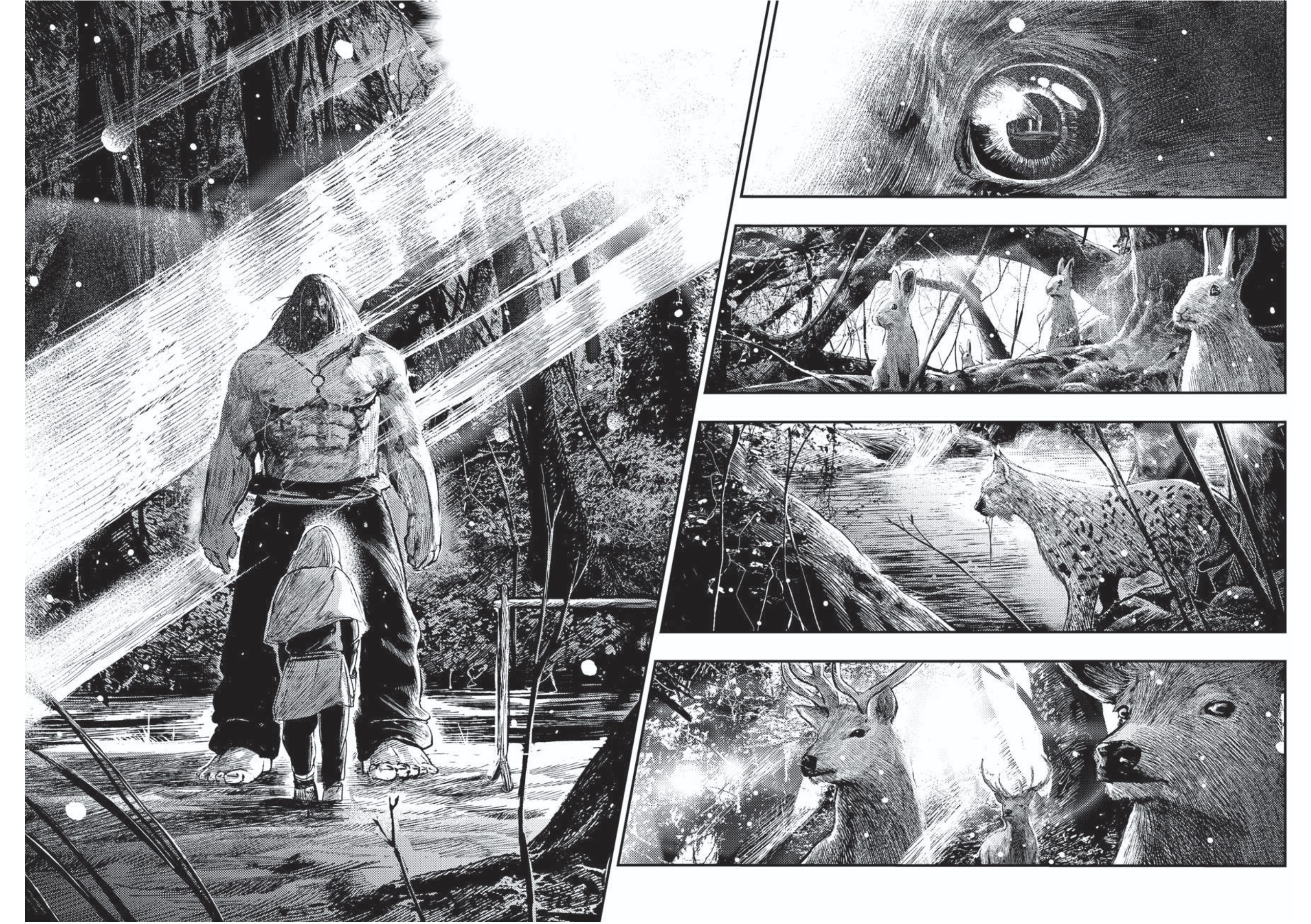 Nous sommes au IXe siècle après J.-C. en Germanie, dans un petit village sans histoire en lisière d’une forêt sauvage. Dans celle-ci vit un géant, véritable colosse tout droit sorti d’un mythe, dont l’apparence inspire instantanément la peur au groupe d’adolescents qui tombent sur sa cabane. Tous ? Pas vraiment, car une jeune fille mise à l’écart car différente des autres, Syn, semble interloquée par ce géant. Elle seule semble réussir à voir au-delà des apparences et déceler la blessure qu’il cache… Cette blessure est celle d’un homme brisé par la guerre et croulant sous le coup de la culpabilité.