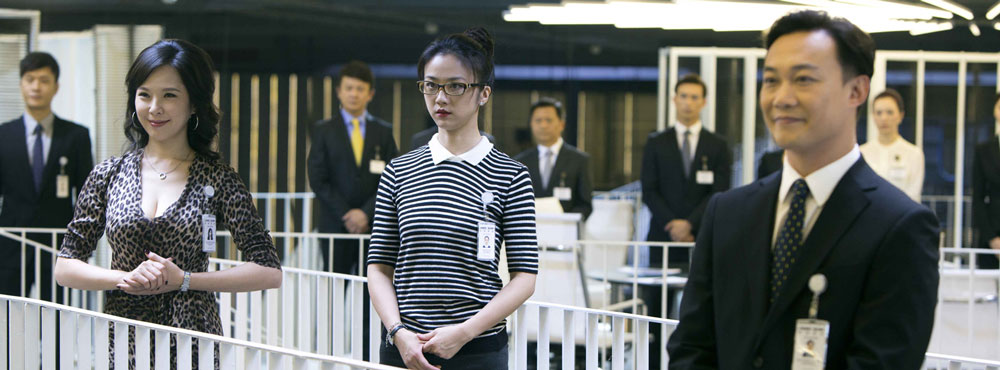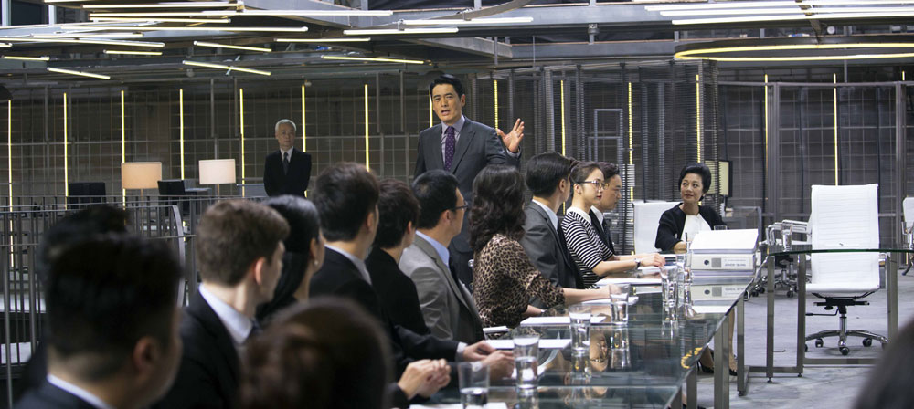 Vus par les yeux de deux jeunes assistants fraîchement débarqués dans la multinationale Jones & Sunn, le pouvoir de l’argent et le cynisme carnassier de ceux qui s’y adonnent, sont les deux piliers sur lesquels Johnnie To semble vouloir bâtir une dénonciation cinglante des dérives de l’économie de marché dans le dernier grand pays prétendument communiste. Pourtant, le fait que ceci ait besoin de se faire par le biais d’une comédie musicale pop et légère pour atteindre son public sans subir l’ingérence d’une censure que l’on sait pesante en Chine est la preuve que le pays n’est pas prêt à regarder la vérité en face comme le firent les États-Unis avec Wall Street, de Oliver Stone, il y a déjà trente ans. Et puisque l’on compare Office au cinéma américain, notons que les récents Margin Call et plus encore The Big Short ont réussi à nous offrir une vulgarisation dans leur traitement du krach financier alors qu’ici, les choses restent opaques. L’effondrement des marchés boursiers semble même n’être qu’un simple rebondissement à mi-parcours du film, qui ne sert finalement que de prétexte à une crispation des rapports de force entre les différents personnages. Ce sont donc les conflits internes, incluant les liens du sang, et l’inhumanité vers laquelle peut mener l’ambition personnelle qui, bien qu’elles restent très simplistes, sont les pistes intéressantes de ce scénario ; et là Johnnie To reste dans un domaine qu’il maîtrise puisque l’entreprise apparaît de fait comme une véritable mafia.