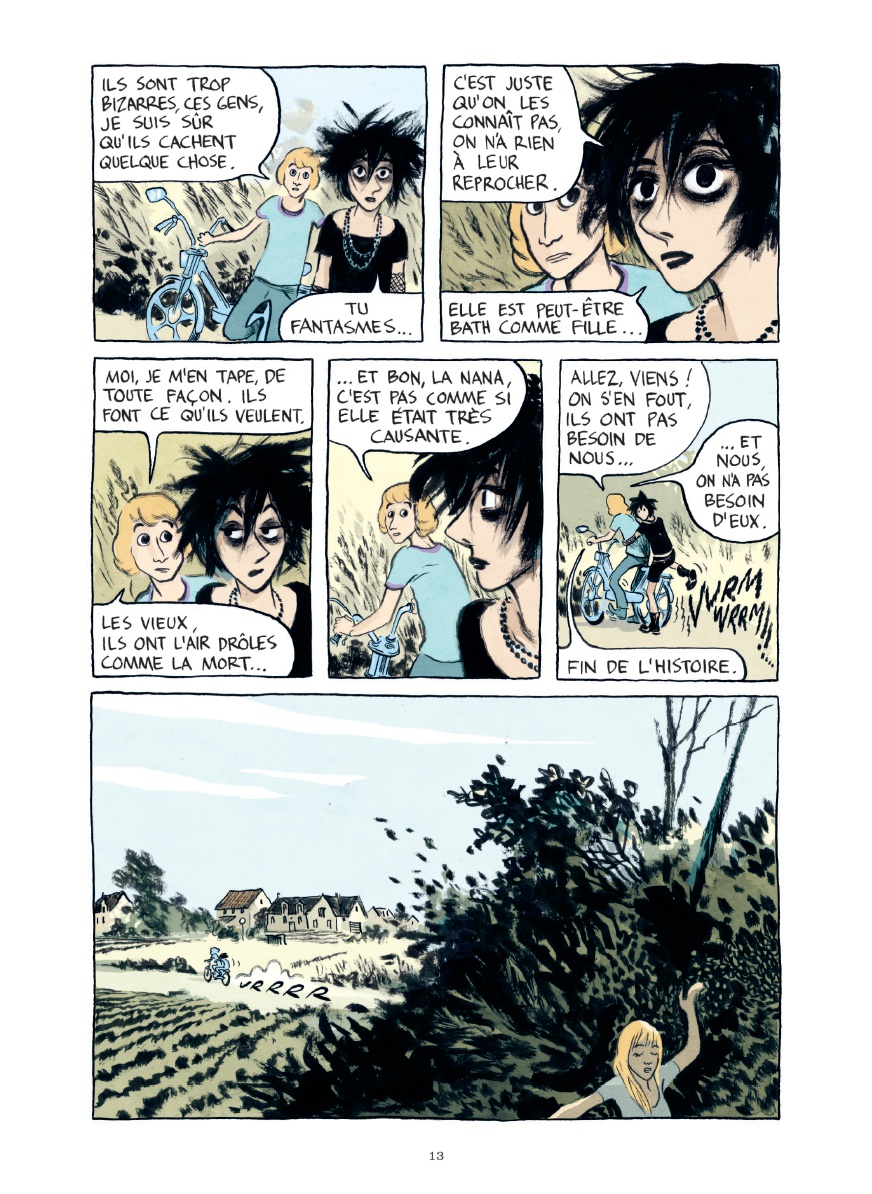 Le livre capte avec justesse ces relations de petits bourgs où l’on apprend à se connaître, où l’on choisit sa bande, où l’on se dispute et se réconcilie. À 14 ou 16 ans, on a des idées larges et des horizons étroits. On tente d’échapper à la reproduction sociale, à l’endogamie du milieu, en se démarquant… en formant des bandes, nouveaux espaces sociaux qui ne changent finalement pas grand chose à la donne de départ. Les journées de vacances s’étirent entre rendez vous au skatepark désaffecté, balades le long des voies ferrées, virées en mobylette ou en vélo, boums d’anniversaire qui agacent les voisins, envies de fuite, fêtes de village avec auto tamponneuses et concerts. Et partout, la musique : The Cure, Cyndi Lauper et d’autres encore. On l’écoute, on la joue, on affiche ses idoles sur les murs des chambres ou sur les tee shirts. Dans cet album, la bande son est une composante essentielle de l’atmosphère graphique, aussi importante que les décors ou les styles vestimentaires. L’éditeur propose d’ailleurs une playlist à écouter en parallèle.