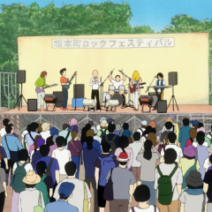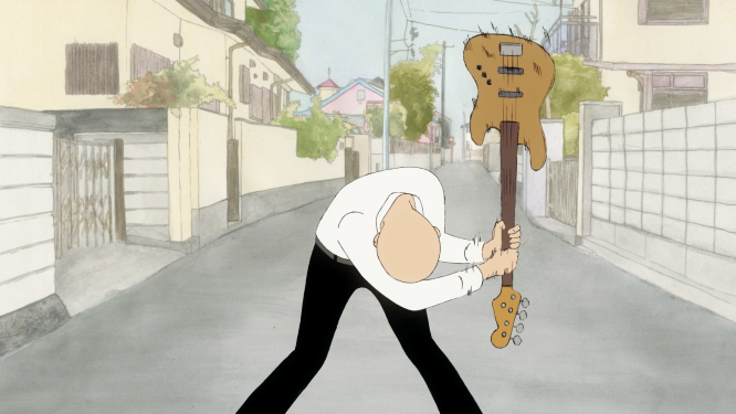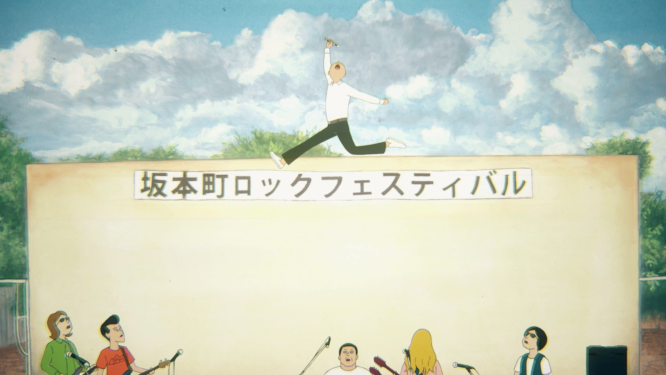 Le dessin animé donne à voir une représentation très morose de la jeunesse japonaise. Si évidemment l’ironie et le burlesque demeurent le point de vue principal, à partir duquel le réalisateur déroule son histoire, il y a beaucoup de désarroi dans cette jeunesse désabusée, sans but, seulement rompue à la stupidité des rapports de force. La musique, signée Tomohiko Banse, Grandfunk et Wataru Sawabe, transporte les personnages dans une existence qu’eux-mêmes n’auraient jamais pensé possible. Le cinéaste parle des relations garçons-filles, du chômage, de la violence des relations entre lycées et du mythe de la famille japonaise, qui ne tient pas toutes ses promesses. Il faut sans doute avoir le bagage culturel suffisant pour appréhender toutes les subtilités de ce manga original, adapté d’un livre de Hiroyuki Ohashi. Pour autant, on assiste à cette aventure musicale, depuis les premiers battements de tambour et la maladresse du grattement de la guitare, jusqu’à la scène d’un festival de rock, non sans un certain plaisir. Le film pourrait presque trouver son pendant américain dans la série Les Simpsons, tant le réalisateur s’amuse, à travers les personnages, à moquer une société totalement désabusée, sinistre à souhait, qui cherche de nouveaux repères.