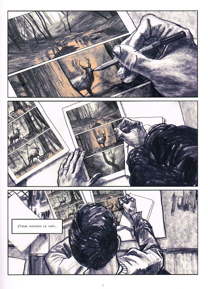 Il y aurait encore beaucoup à dire mais il serait dommage de faire l’impasse sur le style particulier de Laurent Bonneau. A la démarche intellectuelle se joint la recherche graphique. L’auteur part sur un style réaliste qui néanmoins porte clairement les traces de dessin. S’en crée un curieux mélange de visage affiné, de trait crayonné, de fusain, d’encre. Couleurs ocres ou noir et blanc ? On ne s’y retrouve plus. Et quelle importance dans le fond ? Ce style graphique marque un état d’instabilité permanent. Peut-être une manière de montrer la fragilité de ces liens d’amitié, la vaine tentative de vouloir fixer sur la planche quelque chose d’impalpable, ou plutôt la vaine recherche à la question de départ, comme si cette fragilité qui n’apparaît dans les rapports entre ces vieux amis transparaissait par le dessin.