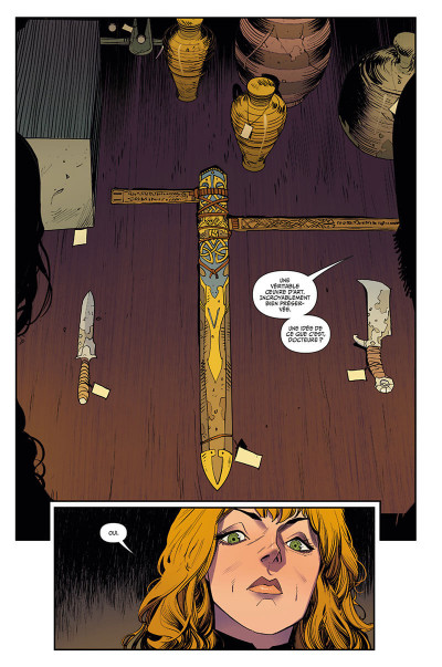 Au niveau du dessin, le trait de Dan Mora ne surprendra pas les habitués de comic. C’est costaud, c’est carré, ça impressionne, ça dégomme, les personnages ont une aura bien sympathique, mais ce qui retient l’attention, c’est indubitablement le traitement du roi Arthur. Sans gâcher l’effet attendu, la reconstruction du corps de Roi, d’abord squelette puis spectre en lambeaux, dans une armure qui transpire la classe, est le point fort du comic. Pas de doute, le dessinateur s’est fait plaisir sur les cuirasses, boucliers et armes, n’hésitant pas à faire un inventaire digne des plus célèbres Donjons et Dragons. On n’est pas loin d’un Birthright qui aurait croisé la route d’un jeu à l’ancienne, type Heroes III ou les Chevaliers de Baphomet pour l’ambiance.