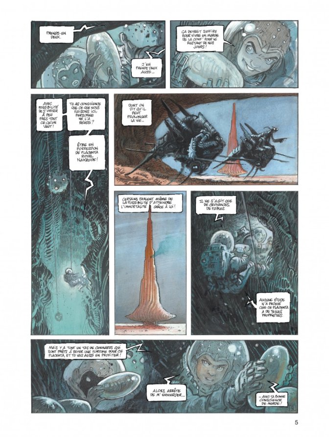 Le dessin est toujours reconnaissable, identifiable au premier coup d’œil. Si je dis qu’il est triste dans ses choix de couleurs (toujours ternes, dégradés de blancs et de gris, impression de poussière, de neige permanente), ce n’est pas un reproche, bien au contraire. Il participe au plus haut point à la mise en scène, à la création d’une atmosphère de saga tragique, où les moments de joie sont rares. On est loin des couleurs flashy de l’Incal ou plus récemment de Sillage, les personnages sont emmitouflés, recouverts de vêtements pour passer inaperçus, sans luxe ostentatoire ni détails affriolants. Les explosions ont également ce caractère froid, inerte, d’autant plus effrayantes qu’elles paraissent inéluctables. Ainsi, une course poursuite avec des trafiquants d’armes peut presque paraître incongrue dans un tel tableau. Il faut donc rendre hommage au talent au coup de crayon de Pellé, qui a su créer un monde bien à lui, à l’image du personnage de Mézoké : froid, mystérieux et pourtant très attachant.
