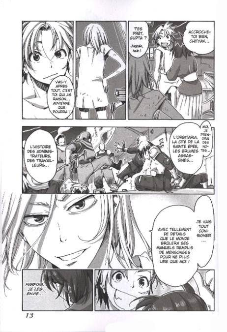 Orbitaria démarre comme de la SF pure, combat de mécha géant engageant le jeune Al et une curieuse jeune femme à l’opulente poitrine – ouh, le doux euphémisme – répondant au nom de Walfran. Contre... Et bien, on ne sait pas trop contre qui. Par contre, ce que l’on découvre assez rapidement, c’est que tout cela n’est qu’un rêve du jeune Al – encore lui – qui va regagner tout penaud sa classe. Al est un fou de mécanique et surtout de mécha, puisqu’il rêve de construire un robot. Toute cette aventure prend gentiment le cours d’une histoire de lycée, avec Gupta, le fidèle et intelligent meilleur ami et Chityak, la copine à l’accorte poitrine – oui, encore - qu’on n’ose aborder. Mais un nouveau rêve soulève l’étrange question « Quel est le monde des rêves et le monde réel ? ». Cette interrogation et a trace d’un médaillon vont confirmer des doutes que Al va vite oublier car ses préoccupations mécaniques vont reprendre le dessus, jusqu’à ce que se passe l’imprévisible, qui ne manquera pas de vous surprendre aussi, vous, lecteur. A moins que vous ne vous soyez rué sur le résumé en quatrième de couverture ou ailleurs, qui vous en dévoile beaucoup plus que ce que nous vous disons ici...