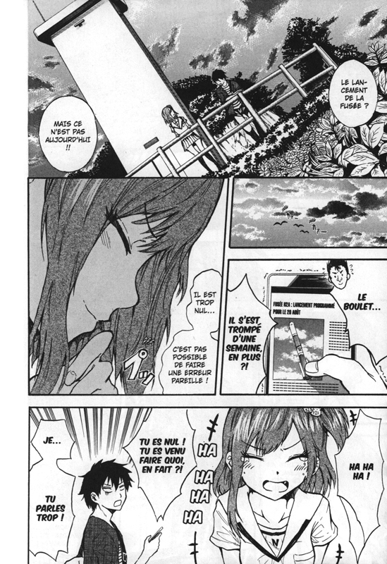 Takeru Furumoto maîtrise ses planches pour faire une histoire lisible, pourtant entrecoupée de nombreux flash-backs. Le défilé de personnages se fait au compte-goutte, mais chacun d’eux est creusé, les traits sont subtils et jamais répétitifs. L’île, qui tient son importance de par sa beauté et sa vue sur le site de lancement des fusées nippones, est une magnifique interface entre le ciel et la mer, deux éléments que l’auteur exploite avec aisance.
