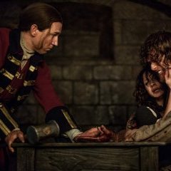 "Plus réussi est le méchant, plus réussi sera le film" disait Hitchcock. A n’en pas douter, il aurait beaucoup aimé Outlander, tant son méchant, anthologique, risque bien de marquer les esprits. C’est bien simple, Tobias Menzies, dont on se souvient surtout pour le rôle de Brutus dans la géniale série Rome, délivre une performance parmi les plus folles qu’on ait pu voir, à la télévision comme au cinéma. A ce titre, les deux derniers épisodes de la saison, particulièrement éprouvants et osés, laissent éclater l’immensité du talent de l’acteur, qui compose un personnage aussi séduisant qu’abject. Il faudra d’ailleurs saluer l’audace des scènes de sexe, qui, enfin, mettent sur un pied d’égalité hommes et femmes dans la représentation de la nudité. Les créateurs de la série semblent d’ailleurs avoir tempéré une triste tendance des séries télés à la surenchère graphique, que ce soit dans des scènes de violence ou d’ébats sexuels. A l’exception du dernier épisode, les ellipses sont nombreuses, et la suggestion largement usitée.