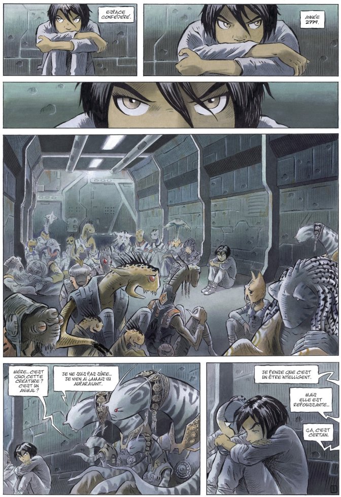 C’est Eric Chabbert qui prend la relève. La continuité avec la série principale est bluffante, tant l’on retrouve ces tons blanc-brun-ocre qui colorent de tristes extraterrestres. Les mines sont déconfites, les décors puisent dans des endroits souterrains, mais la violence n’est jamais farouche, elle ne crève jamais les pages. Que ce soit des brimades ou des morts, les obstacles ne cessent de s’amasser mais on persiste à y croire, à chercher la lumiereau bout du tunnel, et le dessin amène cela à chaque page.
