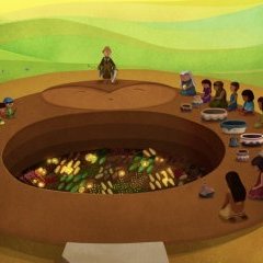 Effectivement, on n’a pas de partition mais on a des instruments qui pour la plupart ont entre deux mille et trois mille ans : des flûtes de pan en terre, des vases avec de l’eau qui font de la musique en fonction de l’inclinaison qu’on leur donne. Je pense que comme dans tout type de film d’animation, la musique est aussi importante que l’univers graphique. Elle n’est pas redondante à l’image ni une simple illustration des décors. La musique, c’est un autre discours du film et une autre façon de faire passer l’émotion, complémentaire des dialogues, de la scénographie et de la création des personnages, donc elle doit être en dialogue permanent avec l’univers visuel et le montage du film. Nous avions envie d’une musique très connotée et très liée à l’Amérique Latine. Juan avait très envie d’être au plus près d’une espèce d’ethno-vérité sur l’univers précolombien de son film. C’était son obsession sur l’univers graphique et visuel du film. Il a eu la même démarche pour la musique, qu’il voulait très enracinée dans l’histoire précolombienne de ses personnages. Il se trouve que le professeur de violon de sa fille était une femme mariée à un ethno-musicien qui travaillait sur la musique précolombienne et avait fait beaucoup de recherches dessus. Juan nous l’a présenté, et il est venu nous voir avec des plumes de condor, des vases, des flûtes de pan et nous a fait un petit concert privé dans le bureau, en dansant avec ses plumes de condor qu’il utilisait comme percussions. Nous avons été immédiatement séduits par ce qu’il faisait avec le souci de ne pas faire une musique trop intello mais qui soit aussi grand public. Pierre Hamon a fait un travail formidable. Il a immédiatement compris ce que nous voulions : une musique ancrée dans la culture précolombienne et en même temps écrite pour la dramaturgie du film. Juan et Pierre ont travaillé en osmose, parfois même lors de séances privées puisqu’ils vivaient à cent mètres l’un de l’autre. La musique est pour moi l’une des plus grandes réussites de Pachamama.