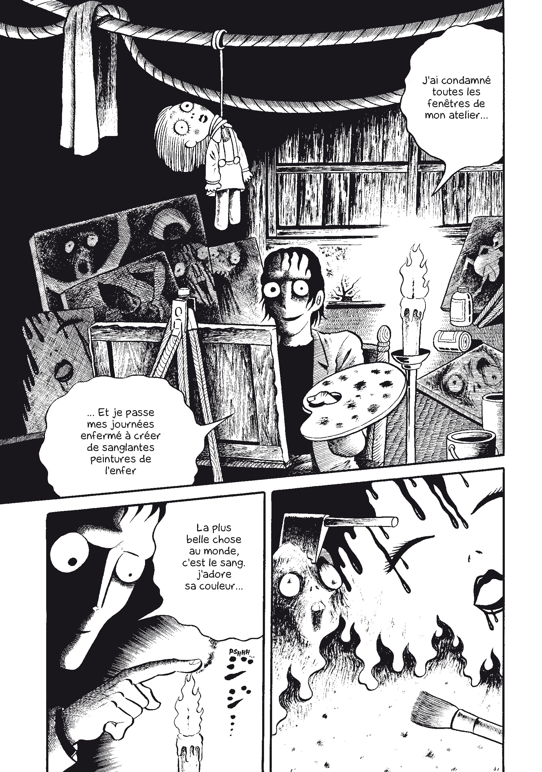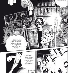 Et cette transmission ressort autant par le récit que par le dessin. De nombreuses cases se font écho par les positions des personnages et le cadrage, insistant sur les comportements se reproduisant de père en fils. Avec son trait rond et bonhomme, on s’attend d’autant moins aux vers grouillant sortant des corps en putréfaction. Dans ce récit, l’ambiance est posée immédiatement avec le visage du peintre, ses yeux exorbités de damné. Dès le départ, Hideshi Hino nous fait comprendre que rien n’arrêtera cet homme, ce qui se confirme par la suite. Le noir et blanc est travaillé pour créer de grandes zones d’aplat noir qui appuie l’ambiance lourde et anxiogène de l’atelier du peintre. Le cadre est posé jusqu’au moment où il explose complètement quand tous les repères volent en éclats. Hideshi Hino joue avec le lecteur, puisque le peintre s’adresse à lui et lui raconte sa vie, le prenant régulièrement à partie, l’intégrant dans son monde dérangé. Au lecteur de garder les pieds sur terre pour ne pas basculer dans l’enfer dépeint par le peintre, et derrière lui, par le mangaka.