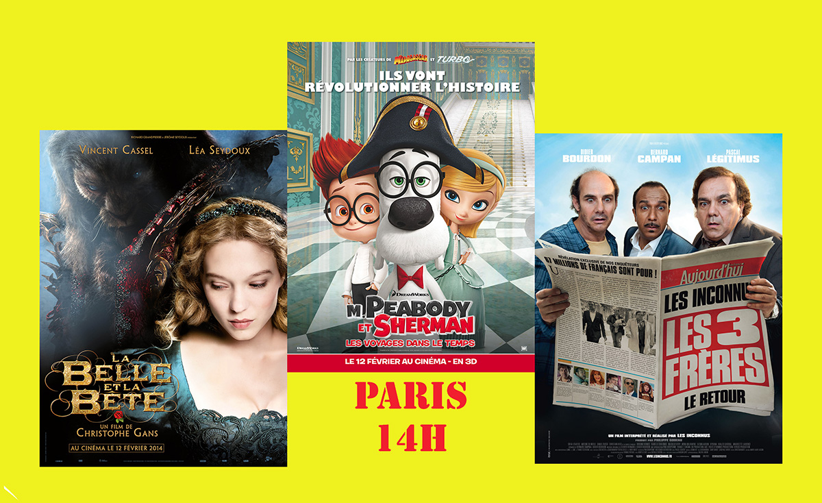 Première séance de Paris 14h, c’est la honte pour les deux blockbusters français, La Belle et la Bête et Les trois frères, le retour. Non seulement leurs scores sont dérisoires pour cette terne journée, mais en plus, avec respectivement 1.803 et 1.506 entrées dans 24 et 22 salles, ils ne parviennent même pas à décrocher la première place qui revient au film d’animation de Dreamworks, M. Peabody et Sherman, qui rameute 1.918 spectateurs dans sa niche. Ce dernier s’approprie donc la première place du classement du jour, avec seulement 18 salles ! On en attendait peut-être trop de ces deux "made in France" pour cette première séance, alors que le matraquage publicitaire faisait rage. Une chose est certaine, sur Paris en tout cas, La Belle et La bête semble mieux engagé que Les Inconnus, et devrait largement profiter des vacances pour s’envoler, ainsi que du tarif à 4 euros pour les moins de 14 ans. Ce qui signifie que ses recettes ne seront pas forcément faramineuses pour autant. Les Trois Frères devrait aussi profiter des congés à venir et pourrait même recevoir un meilleur accueil en province.