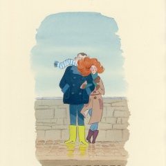 Avec son regard doux et affectueux, François Ravard croque les expatriés en terre armoricaine sur des dégradés allant du blanc cachet d’aspirine au rouge écrevisse en fin de cuisson, au sortir du grand bain.