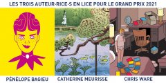 Trois finalistes ont été désignés pour cette année 2021. Fait suffisamment rare pour être mentionné, deux autrices figurent dans la sélection : Pénélope Bagieu, autrice à succès des Culottés et Catherine Meurisse, ancienne dessinatrice de Charlie Hebdo et autrice, entre autres, de La Légèreté. Enfin, le dessinateur américain Chris Ware, auteur emblématique de la bande dessinée alternative avec Jimmy Corrigan, est un habitué des nominations, mais n’a jamais été lauréat. 2021 sera peut-être son année.