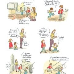 D’un point de vue graphique, cette délicatesse est clairement valorisée, tant les petits personnages amusants, mais aussi les décors tranquilles (on est pas loin d’une ambiance Fais pas ci Fais pas ça) se relaient pour former des pages qui ne sont ni surchargées de certaines BD jeunesse, ni confinées au détail minimaliste de certains romans graphiques. Cet entre-deux est une franche réussite, qui se matérialise par de splendides couleurs d’aquarelle. Cet ensemble débouche sur une atmosphère lyrique, de douce joie et de mélancolie calme imprégnant les planches comme des gouttes et les personnages comme des écrins.