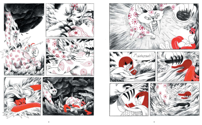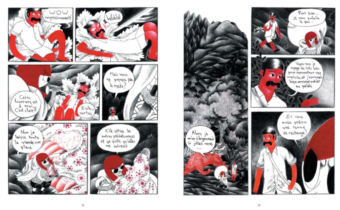 L’univers graphique, tout de noir, de blanc et de rouge, n’est pas sans nous rappeler celui de la série des Ogres-Dieux. Cependant, ce qui au début de la lecture peut sembler être un parti-pris artistique répond au fur et à mesure de l’intrigue à d’ingénieux ressorts scénaristiques. Au-delà, l’originalité de l’œuvre de Gauvain Manhattan réside dans le bestiaire qu’il a créé et les apparats qui en sont issus.
