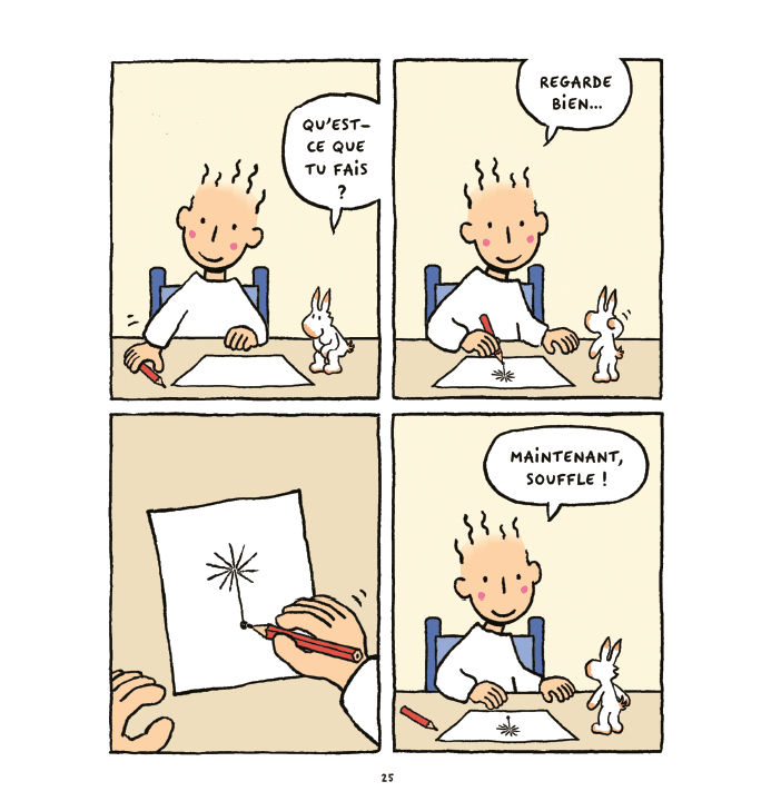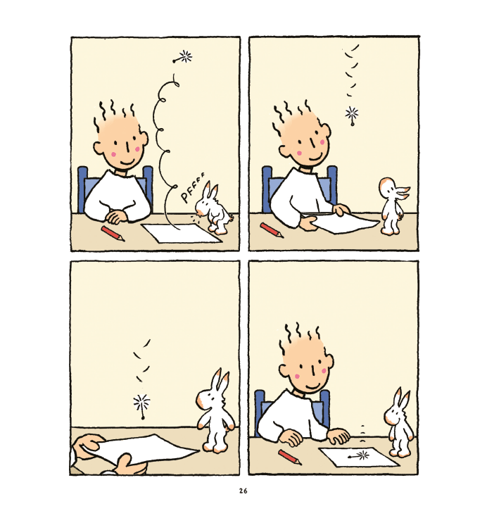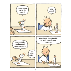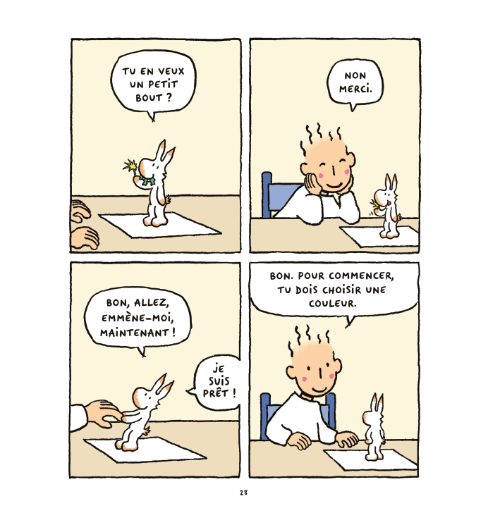 Résumé : Tom dessine un lapin sur une feuille blanche ; il souffle dessus et l’animal prend vie. Le petit garçon demande à son nouveau compagnon de choisir une couleur, puis de partir à la recherche de celle-ci. Le lapin court, saute, descend, monte… et, par lui, Tom vit depuis chez lui des aventures vives, surprenantes et hautes en couleur.