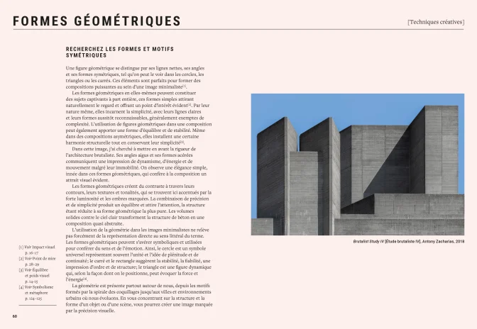 Critique : Antony Zacharias compose ce recueil en quatre parties. Chacune d’entre elles présente plusieurs techniques et précise comment les utiliser dans le cadre de la photographie minimaliste. Chacune de ces méthodes est décrite en une à deux pages, illustrées par une ou deux photos.