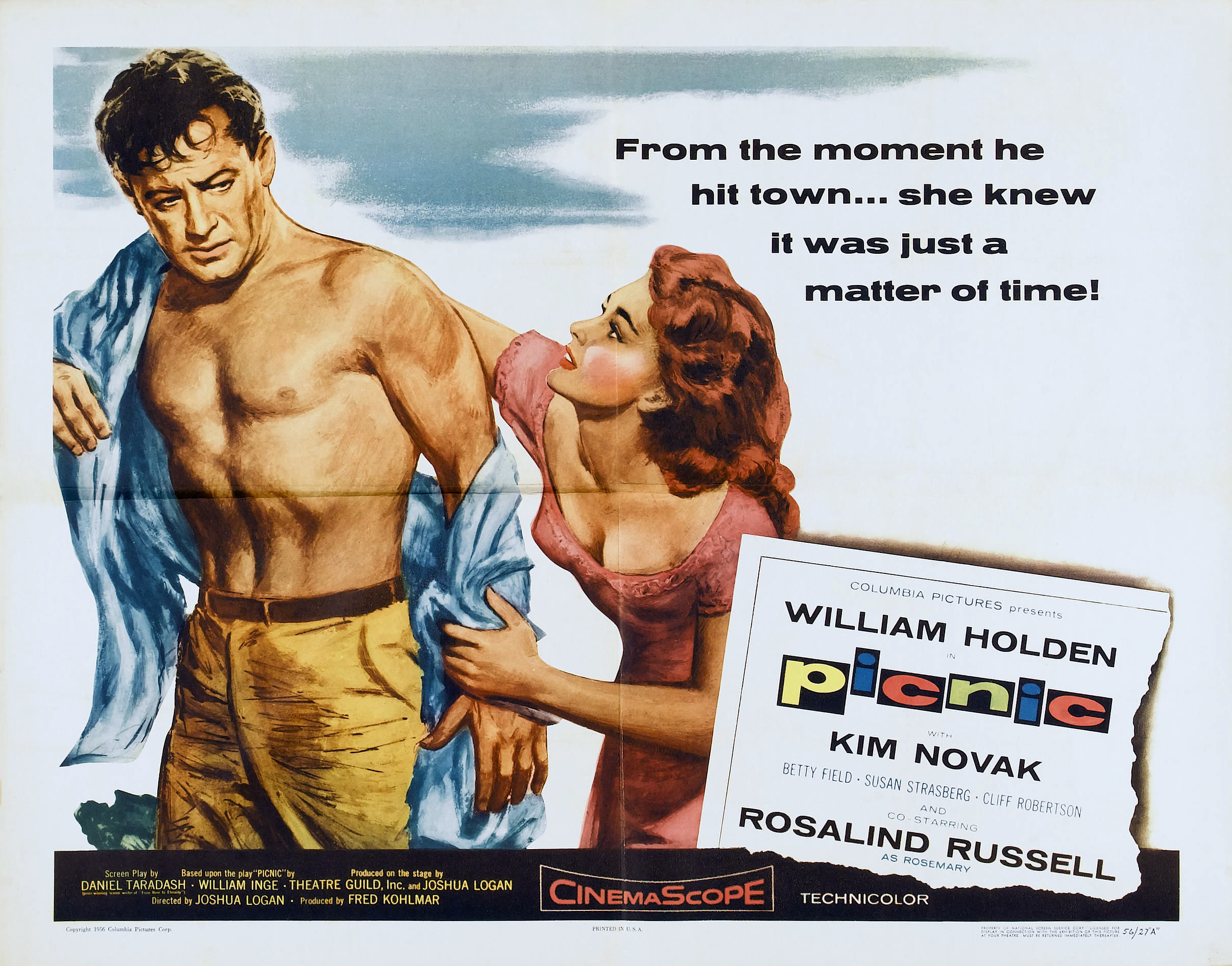 Notre avis : Le film commence par l’arrivée du héros, Hal, qu’interprète avec assez de nuances William Holden, dans une petite ville américaine. Dès l’abord, avec l’ironie d’un cheminot et la pauvreté manifeste du personnage, on sent que rien ne se passera comme prévu. Hal se retrouve en contact avec des gens adorables, comme la vieille dame qui le nourrit, mais autour d’elle ce ne sont rapidement qu’étalages de frustrations : la mère qui a raté sa vie, la professeure célibataire, etc. Voilà pour le quartier modeste ; Hal rejoint ensuite un ami, côté riche. L’excès des retrouvailles nous met encore la puce à l’oreille.