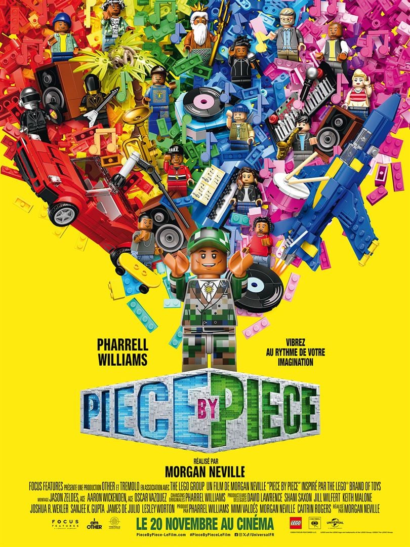 Résumé : PIECE BY PIECE est une expérience cinématographique unique qui invite le public à un voyage passionnant à travers la vie de celui qui est devenu l’emblème de la pop culture : Pharrell Williams. Au gré du prisme d’une animation LEGO®, laissez libre cours à votre imagination et assistez à l’évolution de l’un des esprits les plus innovants de la musique actuelle (synopsis officiel).