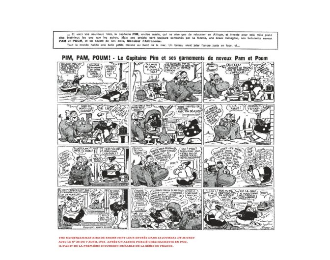 Même s’il s’agit de gags en une demi-planche, nous prenons l’histoire en cours. En effet, Knerr a développé un arc narratif qui a fait voyager le groupe avant qu’il ne s’installe sur cette petite île. La famille réduite, Pim, Pam, Poum est rejointe par le capitaine puis l’astronome, et pour finir par Miss Ross, Adolphe et Léna. Voilà où nous démarrons le récit. Bien sûr, il s’agit principalement de farces que Pam et Poum réalisent au détriment du capitaine, de l’astronome ou encore de Adolphe, qui le leur rend bien. Parfois victimes, souvent coupables, tels sont les positions de chacun des membres de la famille à un moment ou à un autre. Seule la tante Pim reste en-dehors de ces jeux de mains et de vilains pour asséner quelques bons coups de rouleaux à pâtisserie de temps à autre. Nos héros résidant sur l’île de Bongo, on constate au travers de plusieurs gags la présence des habitants indigènes, à savoir le roi et sa suite, le petit Sépia, ou encore un habitant au langage incompréhensible. Et bien sûr, les animaux ont aussi leur part, éléphant, chat sauvage, autruche, bouc… toute une basse-cour domestique et sauvage qui prend part, volontairement ou pas, aux gags de Pam, Poum et Adolphe ! On regrette de ne pas avoir un tome qui se penche sur le moment où Knerr a repris la série, afin de découvrir une période plus ancienne et du coup, moins connue, celle où la famille n’était pas fixée sur l’île.