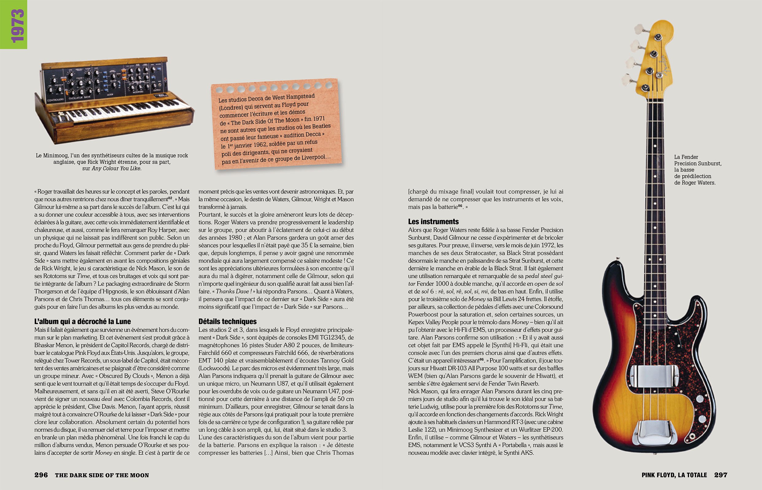 Au passage, le livre s’arrête également sur des acteurs fondamentaux de l’histoire du Floyd comme certains ingénieurs du son ou collaborateurs de l’ombre. Il montre également la place importante – et différente – jouée par chacun des membres du groupe dans la création du son Pink Floyd, que ce soit la rêverie poétique déglinguée d’un Syd Barrett, la folie engagée (et enragée) d’un Roger Waters, l’amour du blues d’un David Gilmour, les influences jazz et classiques de Richard Wright et la rythmique si spécifique de Nick Mason.