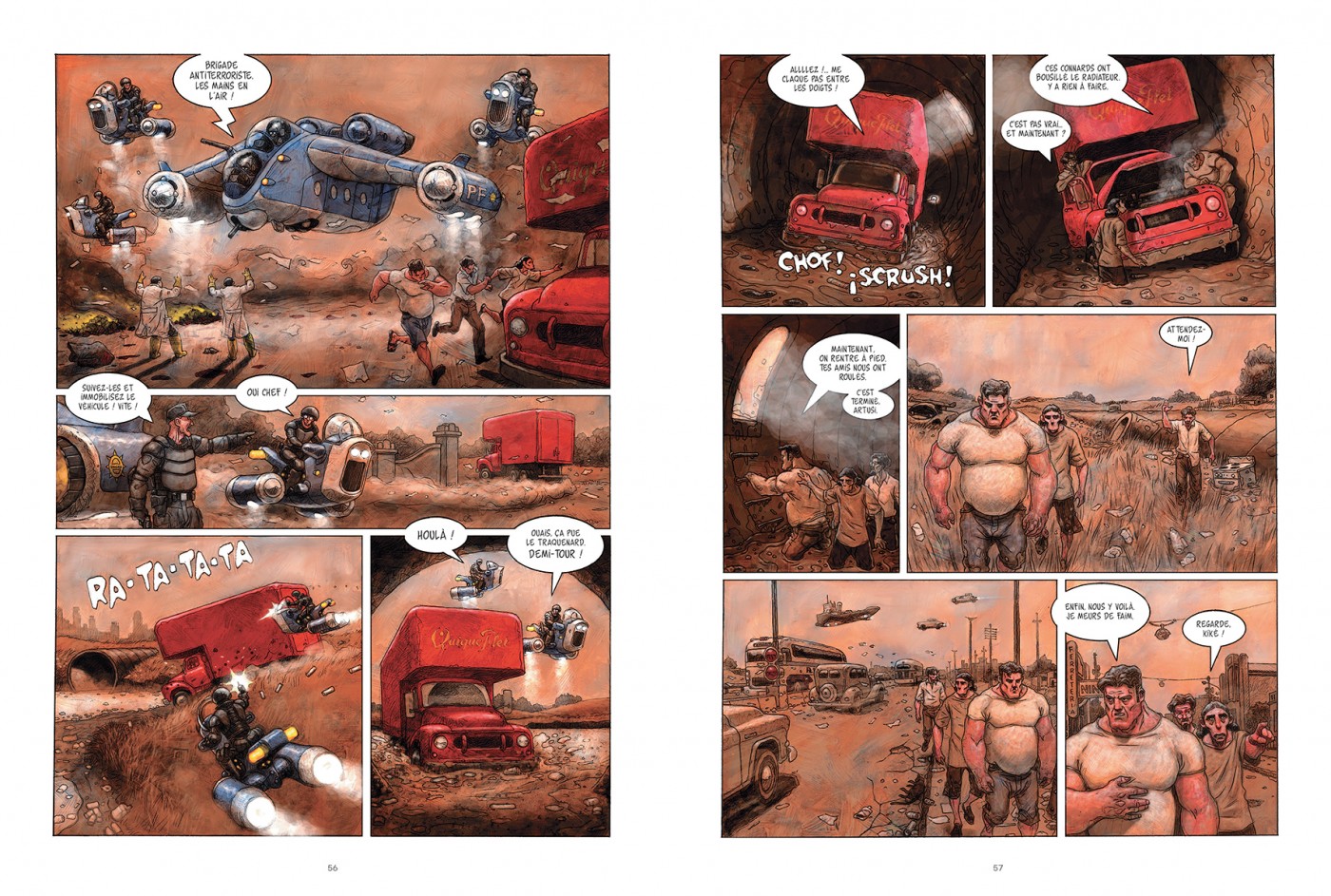 Les pinceaux de Gabriel Ippoliti donnent vie à tous ces personnages et à cet univers en chute, avec un indéniable talent. Le trait semi-réaliste, les couleurs vives comme le camion de Kiké ou ternes comme les bâtiments reflètent bien le malaise de la planète. Le trait texturé renforce encore l’ambiance poisseuse qui règne dans ce monde. D’ailleurs, il faut noter ce travail très riche et très intéressant sur les textures. Tout semble porter un effet, une marque de matière, des plafonds aux T-shirts en passant par la peau des personnages. Ce n’est pas seulement des jeux d’ombre et de lumière, il s’agit d’autre chose.