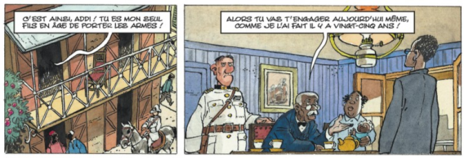Jean-Claude Fournier au dessin et Kris au scénario nous emportent donc dans cette Seconde Guerre mondiale par le biais de ces Français de l’étranger qui n’avaient pas le choix : quitter leurs terres pour venir se battre. Dès le départ on ressent malgré les évènements graves de cette époque une forme de douceur inhérente d’une part au dessin de Fournier et à un scénario qui se veut positif en laissant une place importante au personnage d’Addi et à ses amis Sénégalais.