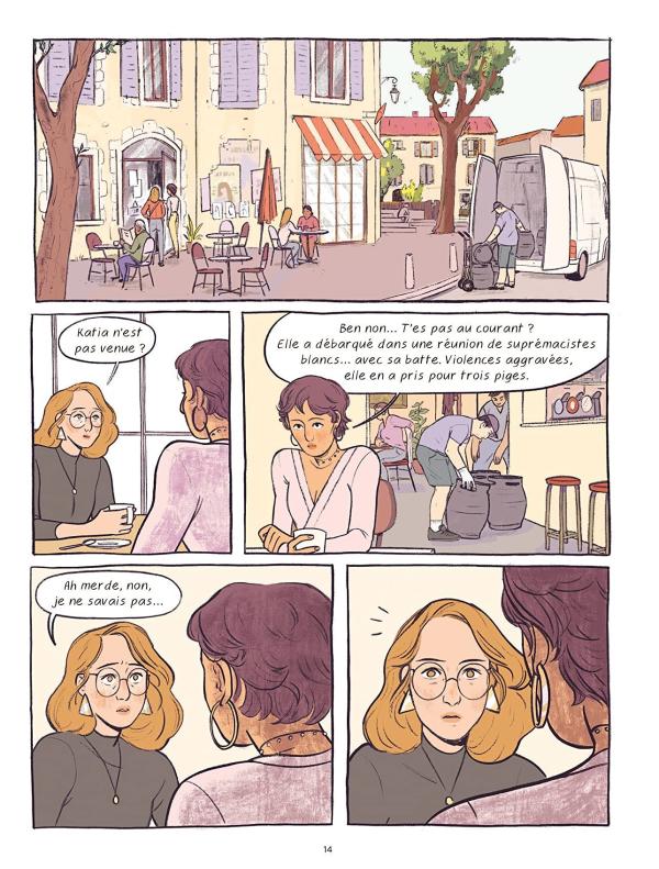 Le dessin chaleureux de Pauline Bertrand explique peut-être ce décalage subi, car les personnages dégagent une sympathie subtile, grâce à leur normalité tout d’abord, puis leurs réactions épidermiques par la suite, qui ne modifient pas profondément leurs traits mais en font des êtres humains normaux, dotés d’émotions. Le cadre de cette petite ville française de province immuable contribue à créer cette sensation de terrain connu, qui d’ailleurs amplifie le malaise. Lentement mais sûrement, ce cadre se noircit et les personnages se raidissent, sans que l’on bascule d’un coup, sans que l’on s’en aperçoive, signe d’un trait efficace.