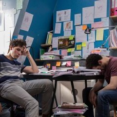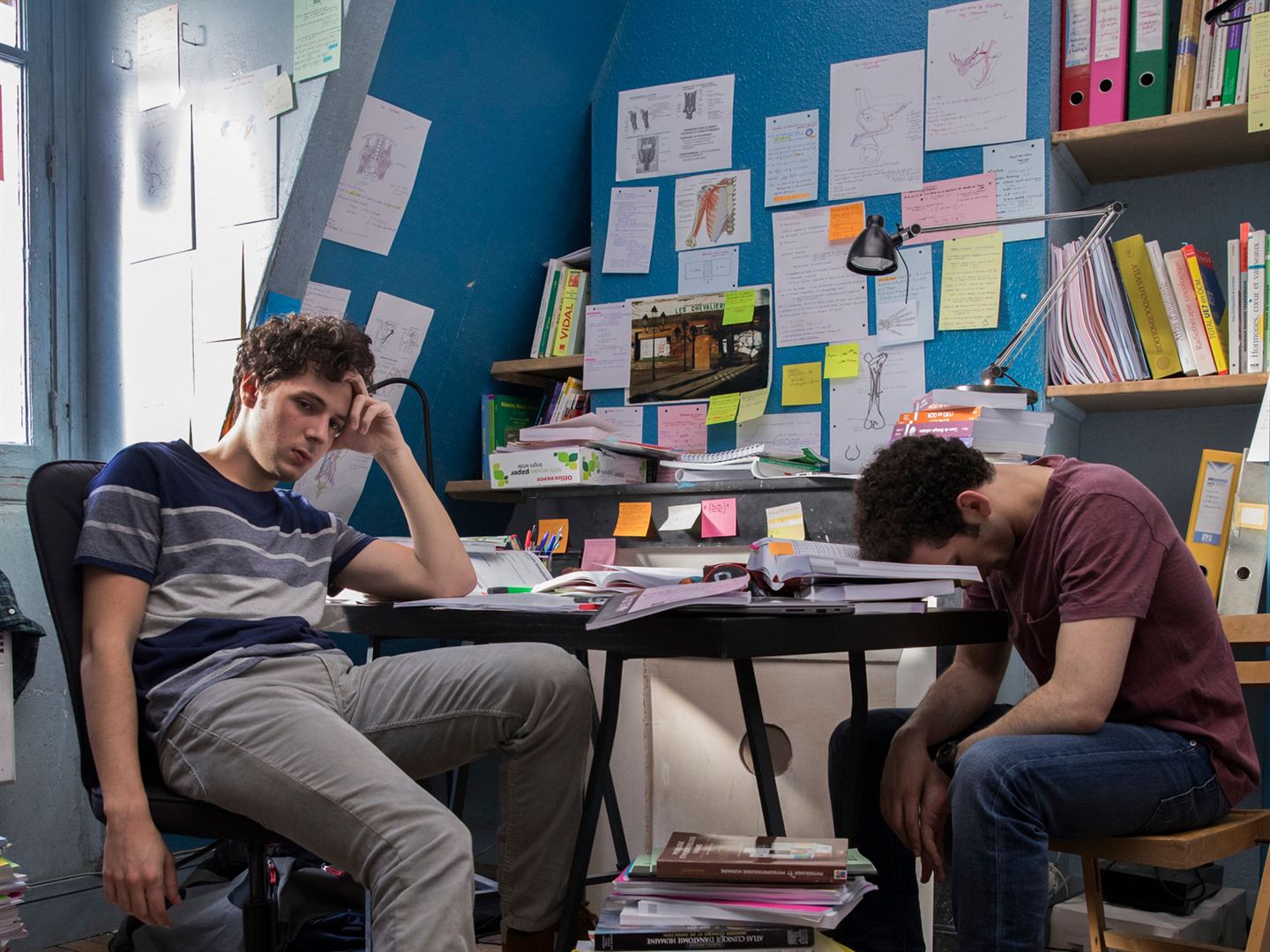 Au service d’une mise en scène classique mais alerte, la caméra nous invite à partager au plus près les amphis bondés où il faut jouer des coudes pour se trouver une place, la BU (Bibliothèque Universitaire) où l’on révise jusqu’au petit matin, la froideur des immenses salles d’examen, l’ambiance fébrile des résultats sans oublier de faire un détour rapide mais significatif du côté de la famille de nos étudiants. Face à l’absence de vie sociale imposée par le rythme stakhanoviste auquel ils sont soumis (la seule once de lien social est maintenue par la rencontre fugace de Benjamin avec sa voisine de palier, une jeune Asiatique qui parle à peine français mais qui ne manque jamais de s’enquérir de son quotidien), la légitime inquiétude des uns face au dédain assumé des autres nous renseignent largement sur les différences culturelles et sociales des deux amis. Le ton bienveillant et jamais moralisateur autour d’un sujet qui aurait facilement pu susciter de la hargne laisse toute latitude à chacun de s’approprier (ou non) les points de vue des différents acteurs de cette tragi-comédie au réalisme affirmé.