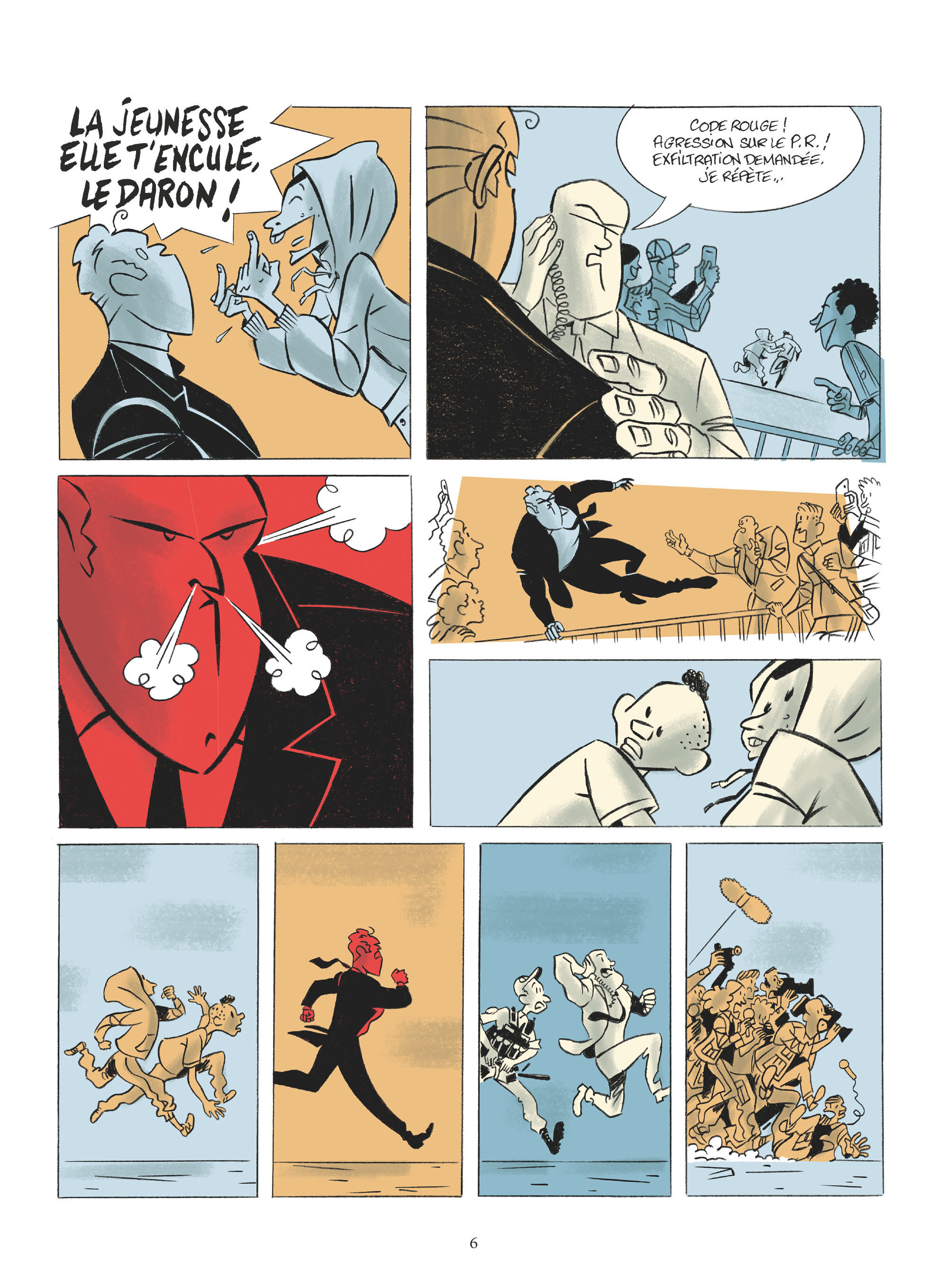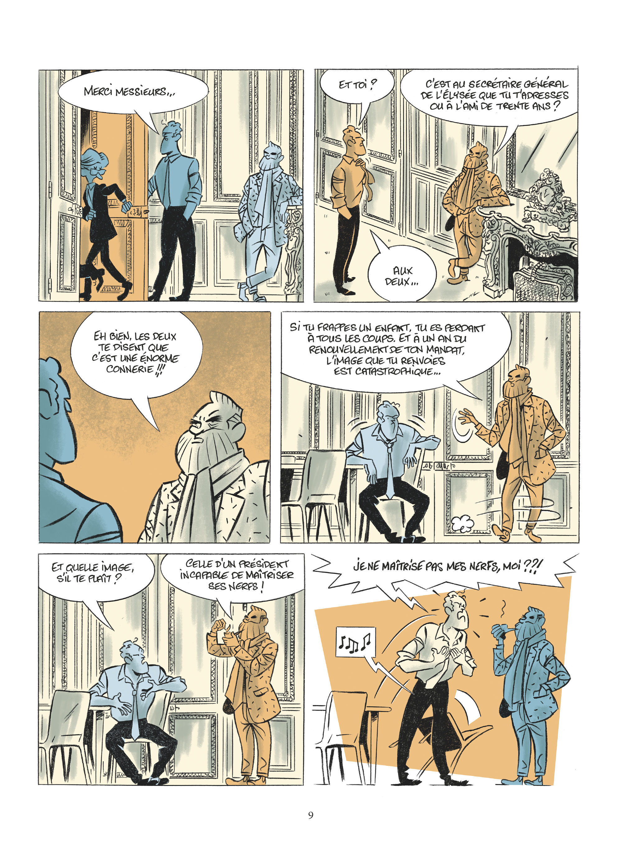 Sur le plan graphique, on sent Jean-Philippe Peyraud influencé par Quai d’Orsay, la grande comédie politique dessinée par Christophe Blain. On retrouve les mêmes scènes d’intérieur, une attention portée sur le mouvement de personnages aux traits simplifiés et anguleux, et des dialogues percutants. Et comme Quai d’Orsay, Première dame s’avère finalement assez tendre avec ses personnages principaux.