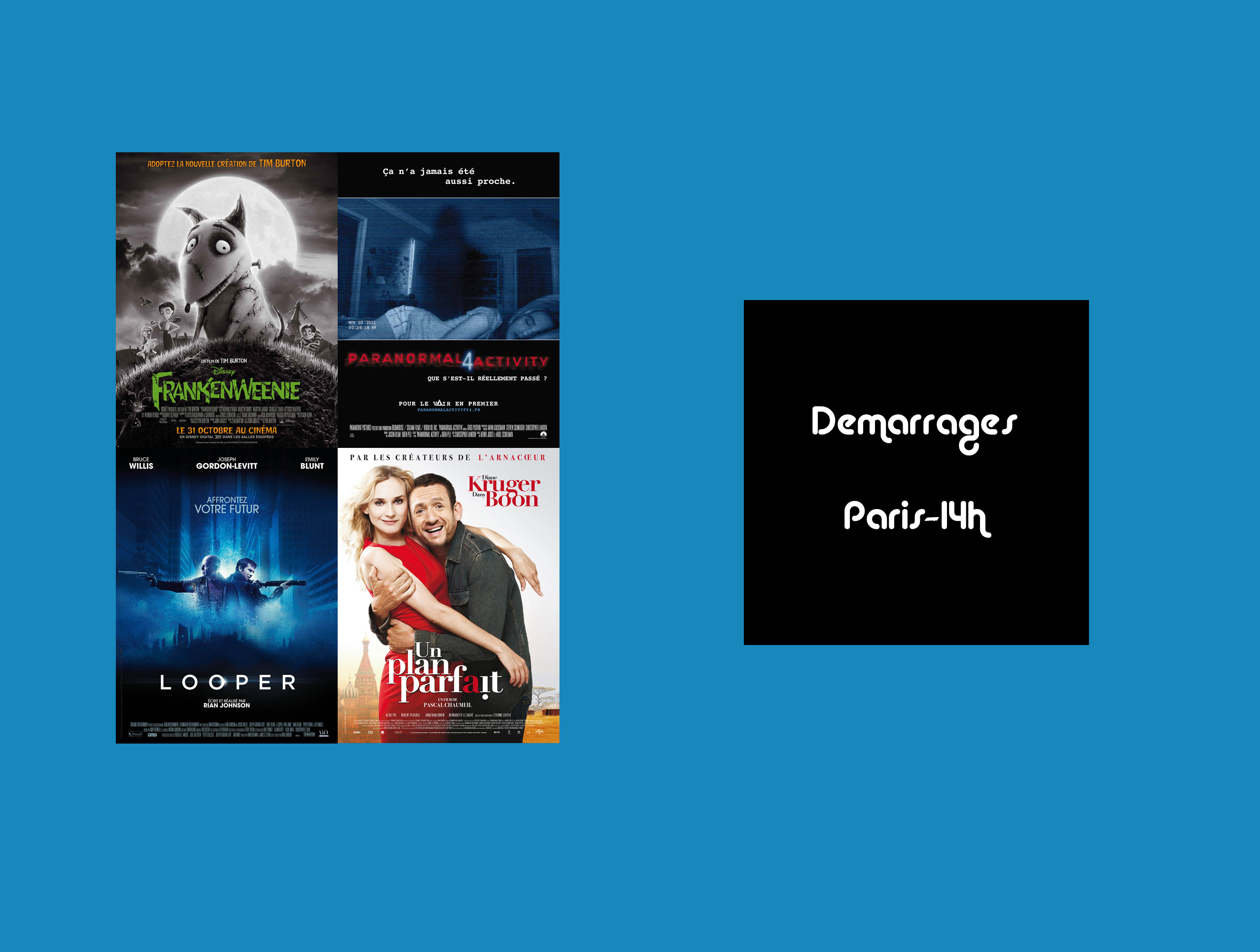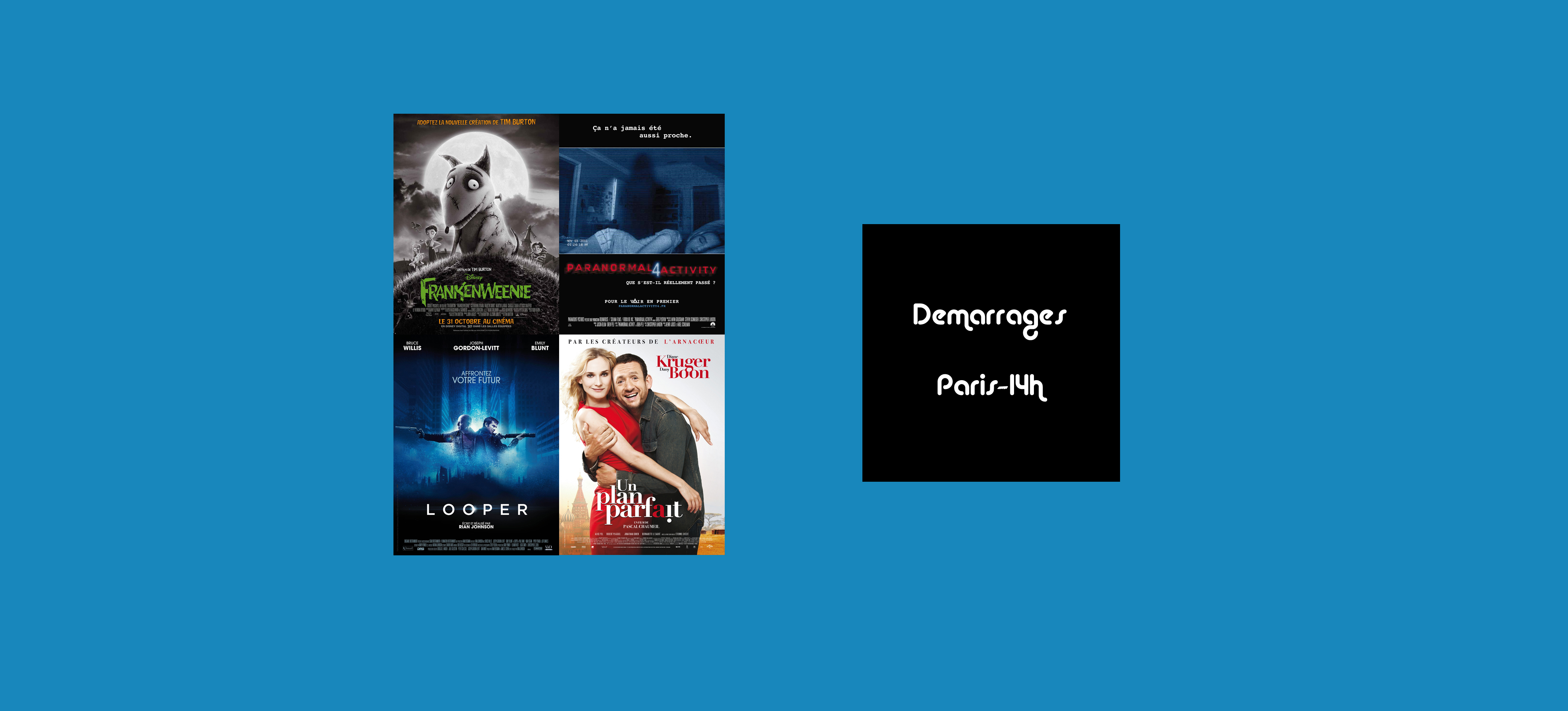 Quid de Paranormal activity 4, Frankenweenie de Tim Burton, Un plan parfait de Pascal Chaumeil avec Diane Kruger et Dany Boon, La traversée avec Michaël Youn et Looper ?