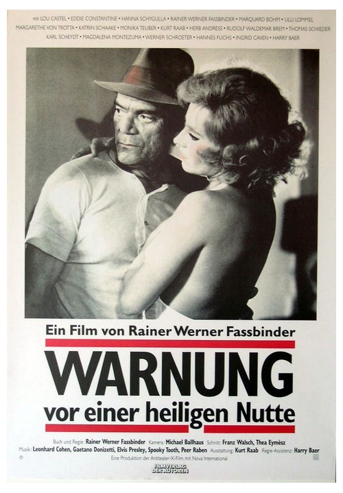 Warnung vor einer heiligen Nutte décrit la préparation d’un tournage comme un incroyable capharnaüm où tout le monde couche avec tout le monde mais où le sexe n’est qu’un moyen d’imposer à l’autre son pouvoir ou de tromper son ennui. Tous les membres de l’équipe ont l’air désœuvrés, n’attendant que d’être insultés, violentés, exploités, renvoyés sans ménagement par le metteur en scène, grand enfant sadique, capricieux et vampirique, qui semble ne pouvoir créer qu’en détruisant tout autour de lui.