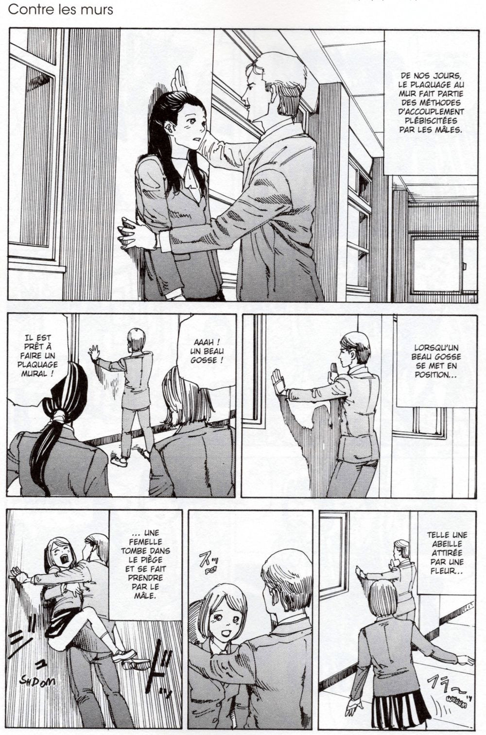 Résumé : {Présence de corps étrangers} commence avec un bel homme s’appuyant des deux mains contre un mur, attiré comme un papillon par la lumière, une jeune femme le rejoint et ils font l’amour. Un groupe d’étudiantes ont décidé de lutter contre la tentation mais malheureusement, elle croise partout ces beaux gosses appuyés contre des murs. S’en sortiront-elles en ayant sauvé leur virginité ? Suivent une galerie de récits tout aussi courts et absurdes...