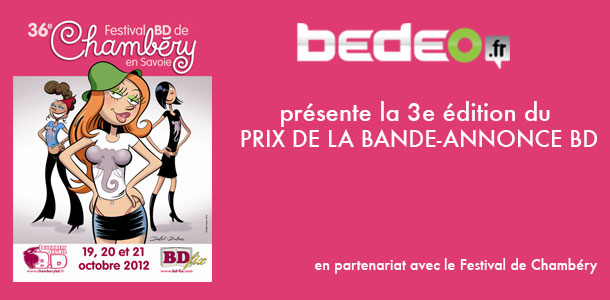 Cette année encore, Bedeo, décernera le Prix de la bande-annonce BD à l’occasion du Festival de Chambéry qui se tiendra du 19 au 21 octobre 2012.