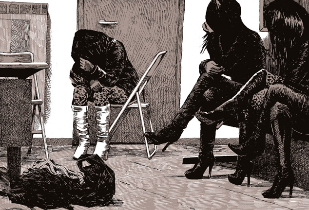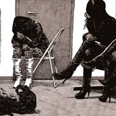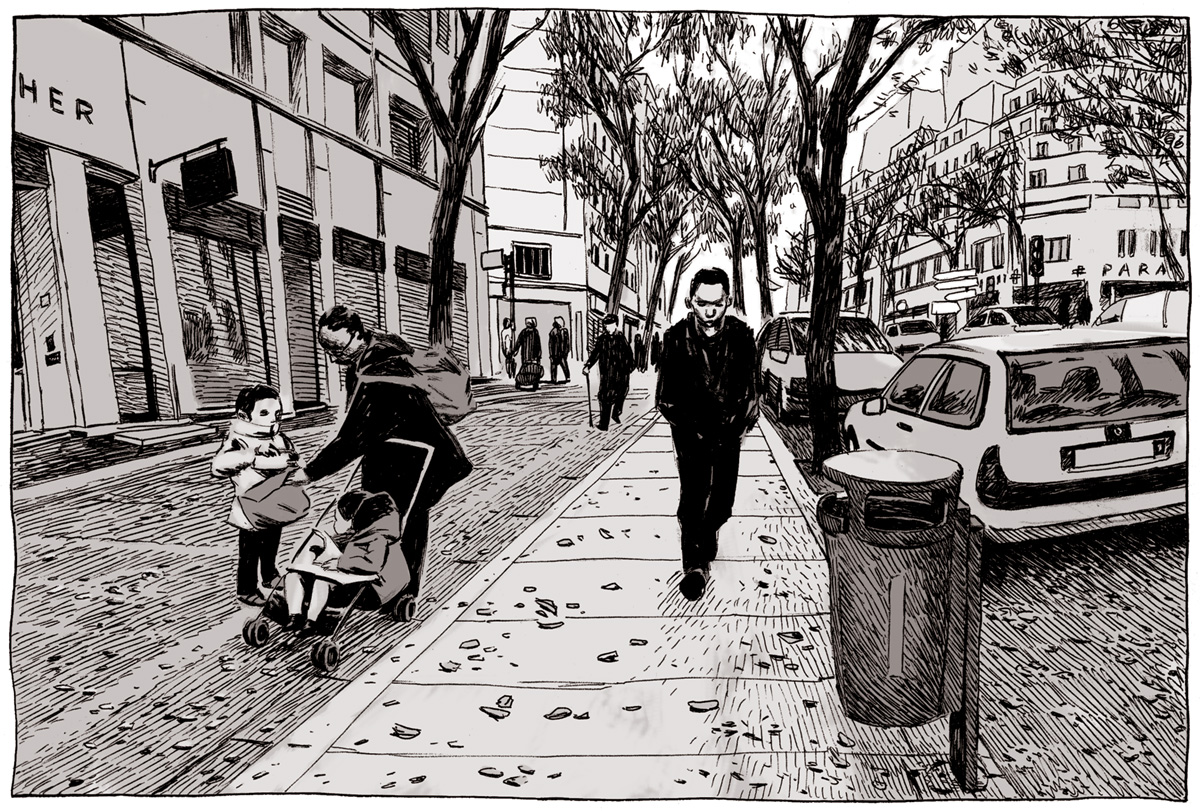 Les mots manquent pour décrire l’œuvre de Tristan Peretton (roman paru en 2005) et Ivan Brun (dessin) : percutante dans son sujet, agressive dans son format, réaliste dans sa trame, écœurante par son approche, marquante à bien des égards... Prof. Fall est un album qui ne peut laisser indifférent, car il est profond et frappant. Profond comme cette fascination de la chute, au sens propre comme au sens figuré, avec cette perpétuelle tension suicidaire et cette envie continue de toucher le fond, celui d’un homme comme celui de l’humanité. Frappant car ses thèmes font mal : du mal-être de la vie dans les barres HLM, de la prostitution dans la banlieue de Lyon, jusqu’aux massacres dans les campagnes angolaises, en passant par les rites sacrificiels... Tout paraît tellement vrai qu’on se sent mal à l’aise, l’estomac retourné par des pages qui claquent, qui montrent des éléments perturbants tantôt terriblement morbides, tantôt très quotidiens, sans savoir lequel des deux est le plus choquant. La lecture est difficile car la narration est saccadée, découpée entre plusieurs histoires, toutes reliées : Michel est un employé de la Sécu, menant une vie qu’il trouve passable, et qui va être bouleversée le jour où il croise le regard de Domingues, un ancien mercenaire proxénète. Il va alors avoir des visions de l’ancienne vie du soldat, engagé en Afrique, tueur de prostituées en France. Conscient de sa folie, il va mener sa propre enquête, s’enfermant, se repliant chaque fois un peu plus au gré des cauchemars ou visions. Au milieu, des parenthèses s’ouvrent sur la vie en avance rapide d’un clochard, d’une grande-tante, d’un officier adolescent d’une armée révolutionnaire... Tout cela avec une limpidité journalistique, une objectivité réaliste, mais aussi un flot d’émotions à disposition, qui fait osciller l’album entre un compte rendu de reportage mené par l’ONU et les exactions fictives d’un Jonathan Littell dans ses Bienveillantes.