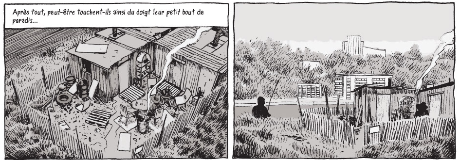 Les immenses pages blanches striées de noir achèvent de donner un rendu glauque à l’ensemble. Rappelant l’excellente adaptation du Rapport de Brodeck par Larcenet, Prof. Fall exerce également un charme envoûtant et malsain dès les premières pages. Des tours d’habitations de béton des cités françaises aux charniers des combats de l’Angola ou du Mozambique, chaque lieu est approprié sans clinquant, avec cependant son lot de symboles, surtout dans les pages qui marquent un nouveau chapitre. La mort et le sexe sont effectivement étroitement liés dans un ballet repoussant, car appelant aux racines sauvages de l’être humain. Cette part d’ombre qui découle de toute guerre, de tout conflit, même si le viol et l’abandon de la dignité des femmes touchent aussi les zones périurbaines de toutes les nations européennes, pourtant en paix. Les dessins explicites, tout comme les ombres implicites contribuent à créer d’abord un album de la dépression, puis un polar fantastique, avec une lignée finale d’horreur érotique. Dans tous les cas, une ambiance de contrastes , où l’obscur prend sensiblement l’avantage sur le clair.
