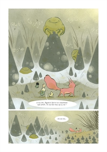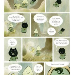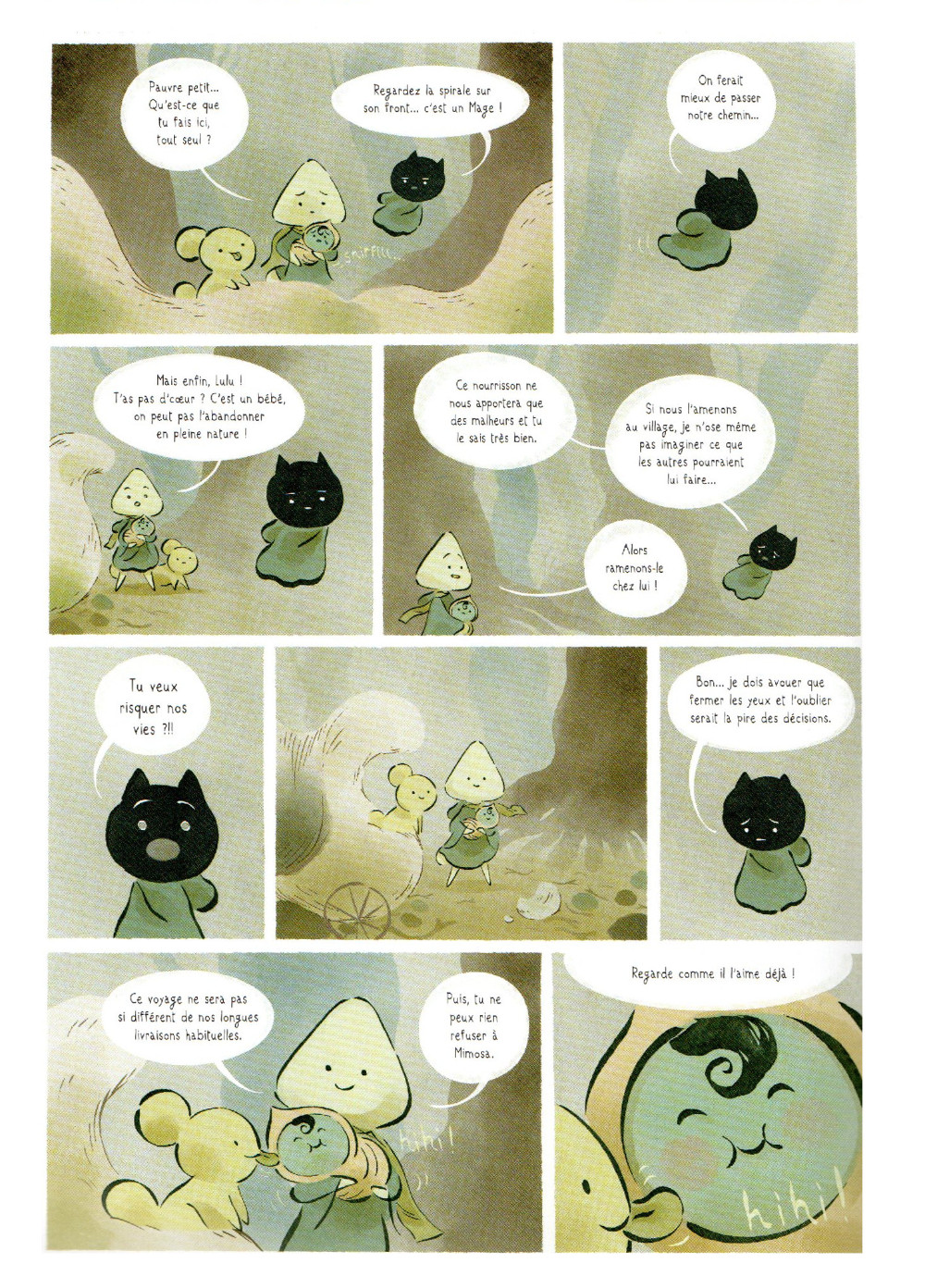 Le dessin propose ainsi une ambiance à la Miyazaki, avec ces petits êtres accompagnés d’animaux imposants mais doux, le tout évoluant dans un décor où la nature a une place primordiale. Pas d’humains, pas de contacts, pas la moindre évocation si ce n’est ce peuple des Mages, un peu hautains, qui peut rappeler les traits de l’espèce dominante de notre planète. Ils sont toutefois très secondaires, voire concentrés sur si peu de pages qu’on les oublie au profit des personnages aux noms de plantes, qui chantent la gloire de la terre, avec ou sans T majuscule.