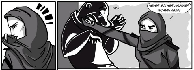 Depuis septembre 2013, la communauté des super-héros égyptiens compte une nouvelle héroïne dans ses rangs. Habillée de son niqab comme une ninja, Qahera combat la misogynie, le harcèlement sexuel et les préjugés islamophobes, à coups de sabre et de leçons de morale, sur un web-comic en anglais et arabe : http://qahera.tumblr.com/.