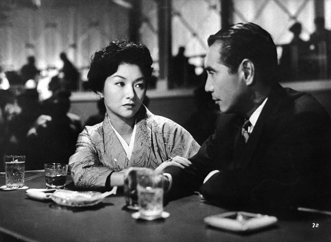 Elle se paye surtout au prix d’humiliations récurrentes, notamment lors des deux scènes avec la propriétaire, glaçante de fausse sollicitude condescendante (elle reproche à Keiko de porter un kimono trop sobre), et dans ses rapports avec les hommes : le suffisant Minobe (Eitaro Ozawa), qu’elle ne peut se permettre de mépriser ; le trop paternel Goda (Ganjiro Nakamura) ; le bonhomme Sekine (Daisuke Kato) qui se révèlera gentil mythomane et affabulateur (la rencontre avec sa femme, superbe scène de décillement à l’air libre, dans un vaste terrain vague) ; le suave Fujisaki (Masayuki Mori), qu’elle aime et qui l’aime sans doute mais lui avouera au lendemain de leur première nuit commune qu’il est muté à Osaka et part le jour même avec femme et enfants ; et même Komatsu (Tatsuya Nakadai), le jeune gérant qui la poursuit de ses assiduités mais qui l’idéalise trop, la met sur un piédestal et ne supporte pas de la voir en tomber.
