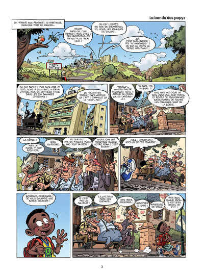 Le premier gag peut faire peur : trois papys sur un banc, pour paraphraser la chanson de Gotainer, mais qui ne parlent pas de la pluie et du beau temps. Ils évoquent, d’une manière assez raciste, les nouveaux arrivants de la cité. Le tour de force de Stéphane Louis est, en un gag puis en quarante-huit pages, de nous rendre sympathique ce trio de seniors mais aussi la bande de jeunes qui zone autour de la cité, les pochtrons du bar, les enfants un peu moqueurs du quartier Fovéla et tous les habitants de la Fierté-aux-fraises. En fait, l’humour de la BD repose sur des provinciaux qui découvrent des banlieusards, des vieux qui fréquentent des jeunes, des jeunes qui s’amusent avec les enfants, et tout ce petit monde, fait pour ne pas s’entendre, passe son temps à se disputer, mais sans méchanceté ni rancœur, mettant à mal les clichés que l’on peut avoir sur chacun d’eux.